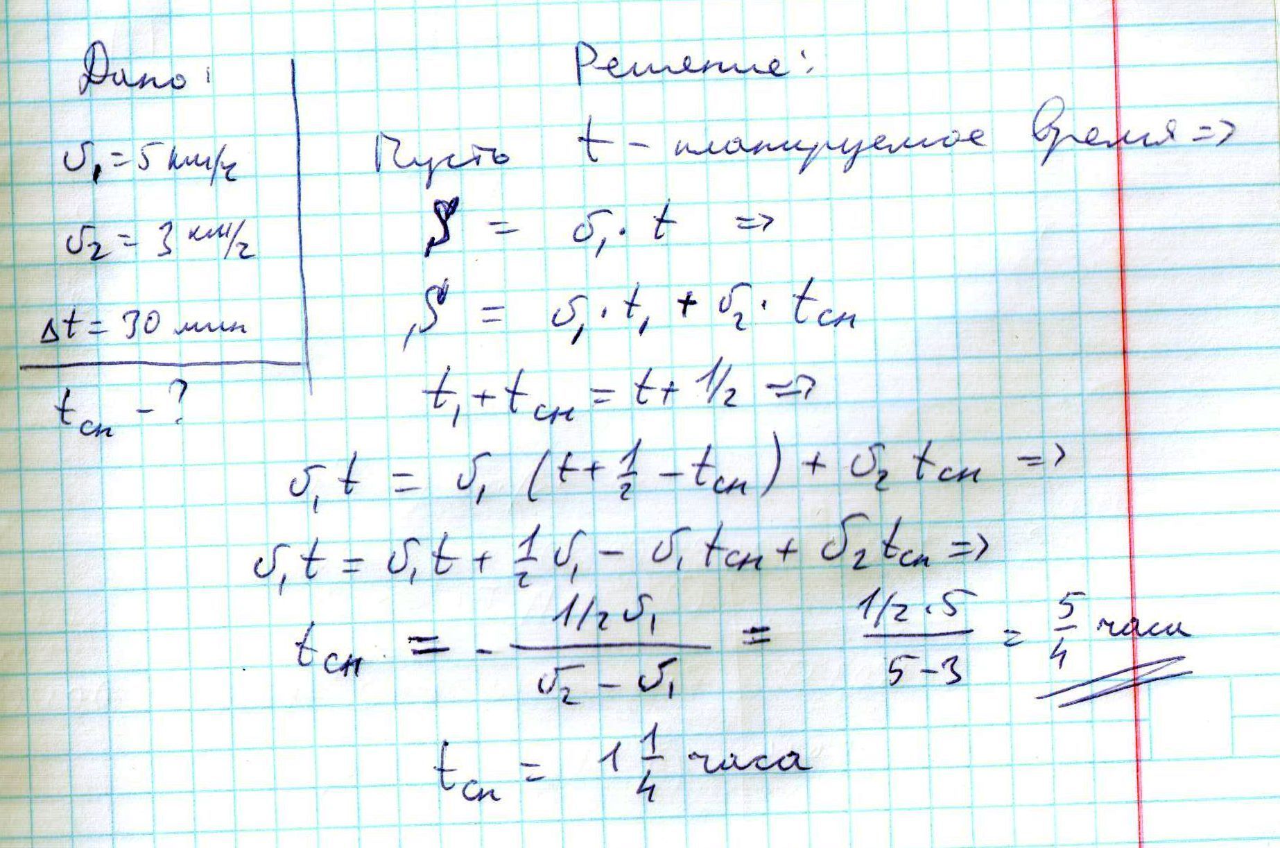 Чтобы попасть на место в заданное время, Емеля пошел из деревни со скоростью v1 = 5 км/ч. Начался сильный снегопад, и он снизил скорость до v2 = 3 км/ч. Когда снегопад кончился, Емеля продолжил идти со скоростью v1. В результате, в город он прибыл на 30 мин позже запланированного. Сколько времени шел снегопад?