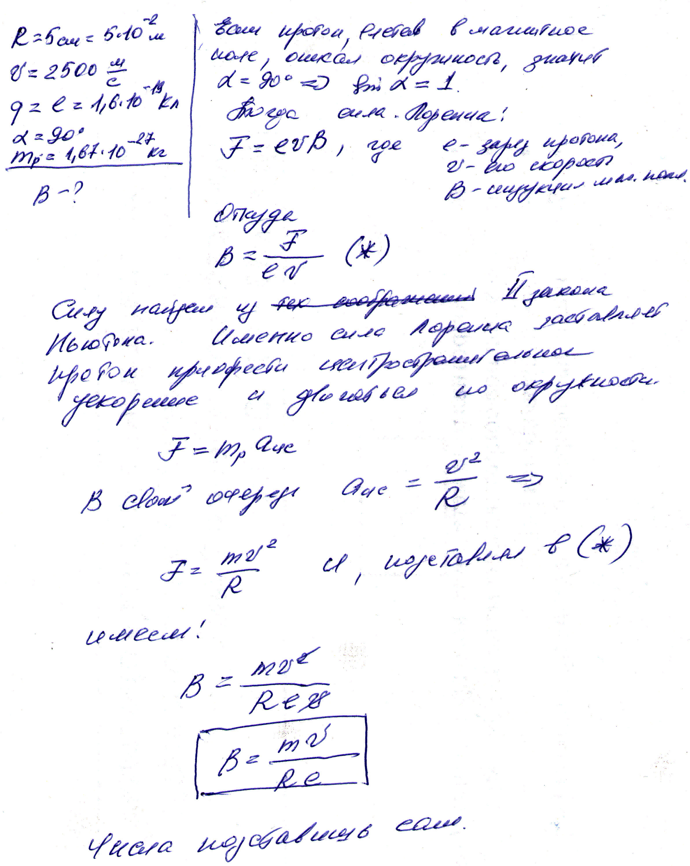 протон в магнитном поле описал окружность радиусом 5 см. Найти магнитную индукцию поля , если скорость протона 2500 м/с.