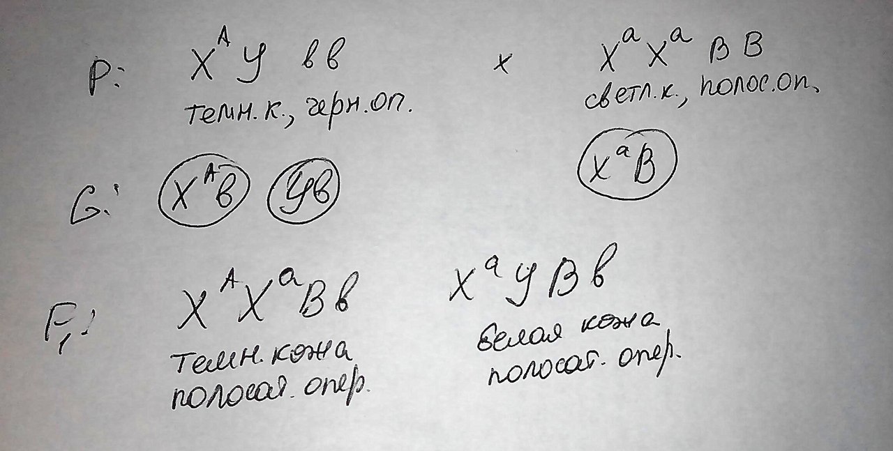 В итоге скрещивания получились 50% полосатых с темной кожей и 50% полосатых со светлой кожей цыплят.