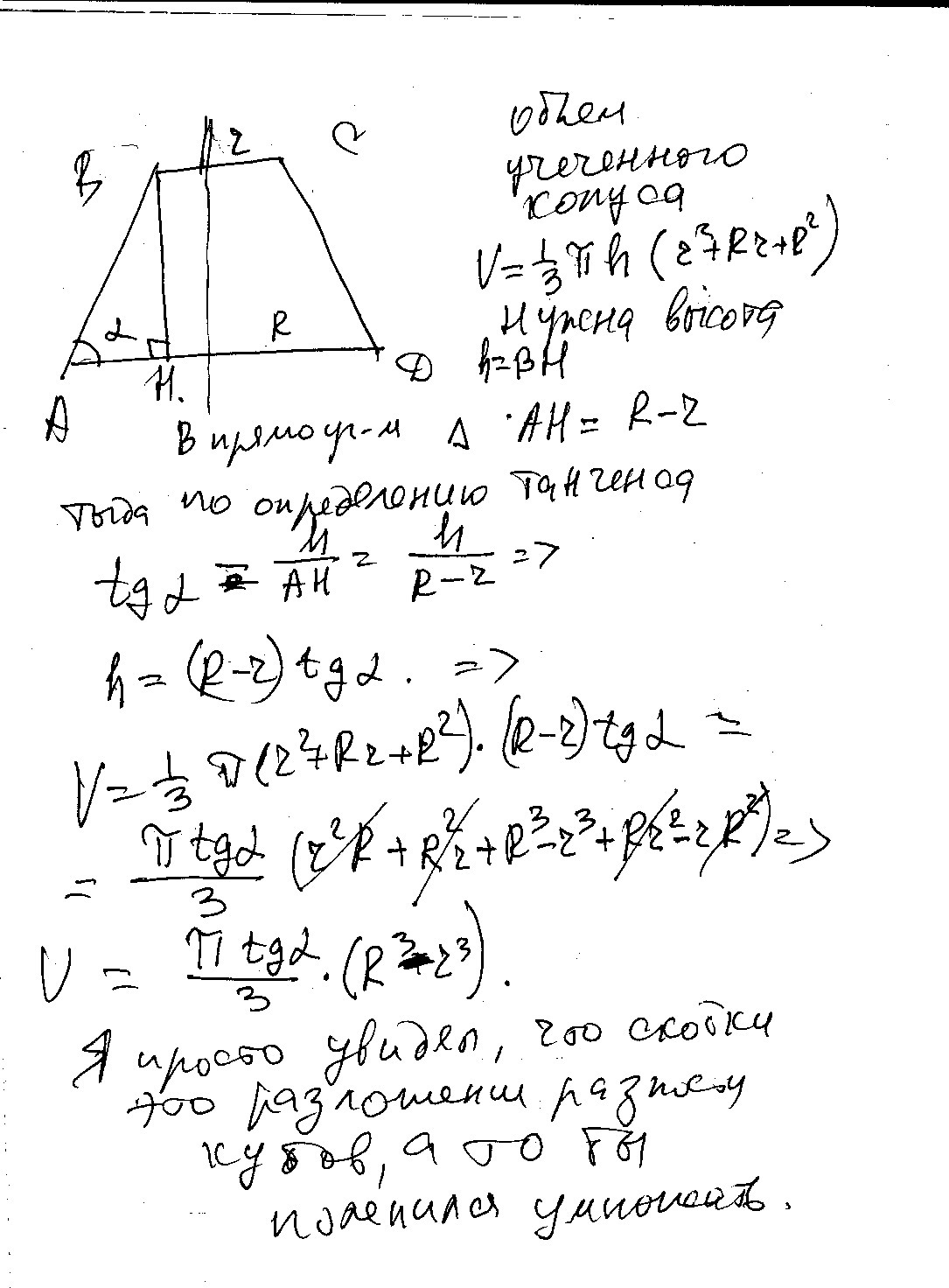 Радиусы оснований усеченного конуса r и R, образующая наклонена к основанию под углом a. Найти объем усеченного конуса.
