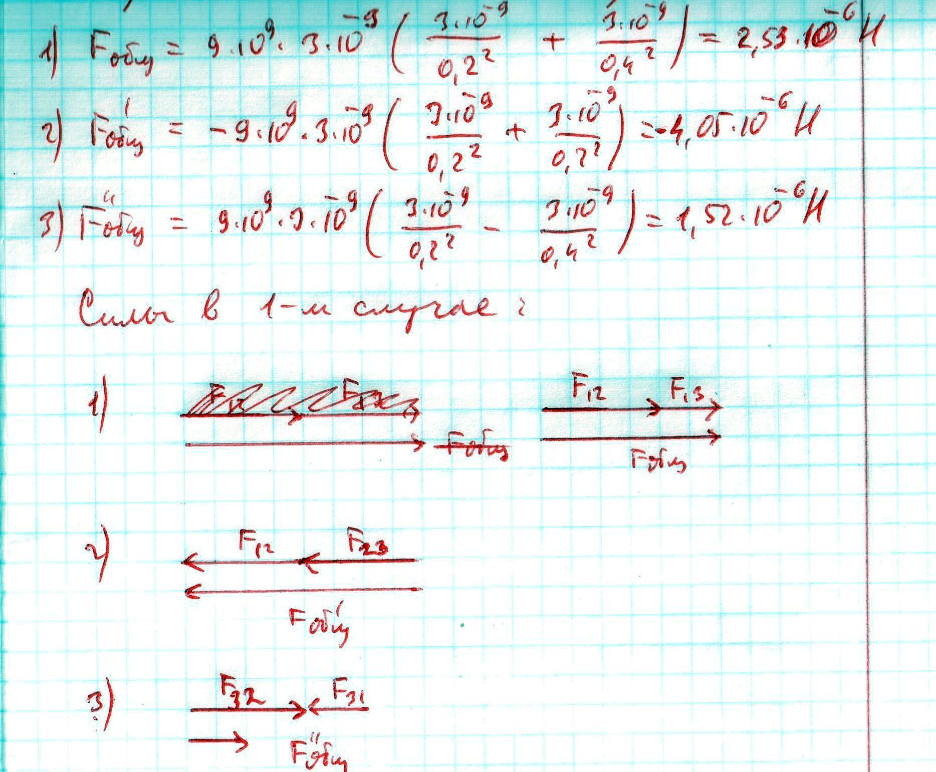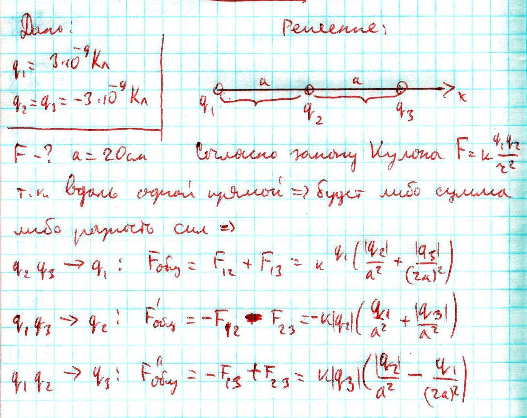 Три точечных заряда Q1=3·10-9 Кл и Q2= Q3 = -3·10-9 Кл расположены вдоль прямой так, что второй заряд Q2 находится между другими на одинаковом расстоянии а=20 см от них. Сравнить между собой модули сил, действующих на каждый заряд со стороны других зарядов, и в определенном масштабе изобразить векторы этих сил на схеме расположения зарядов.