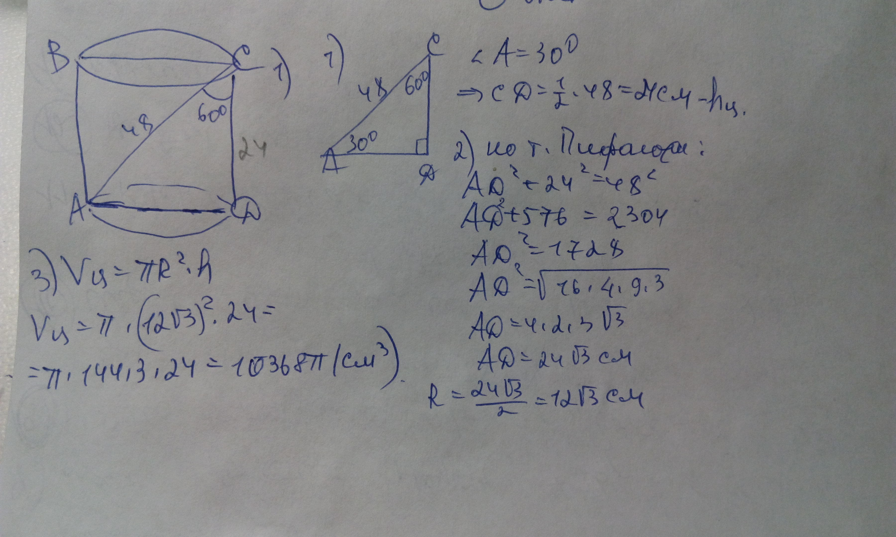 Диагональ осевого сечения цилиндра равна 48 см Угол между этой диогональю и образующей цилиндра равен 60 градусов.надите объем цилиндра