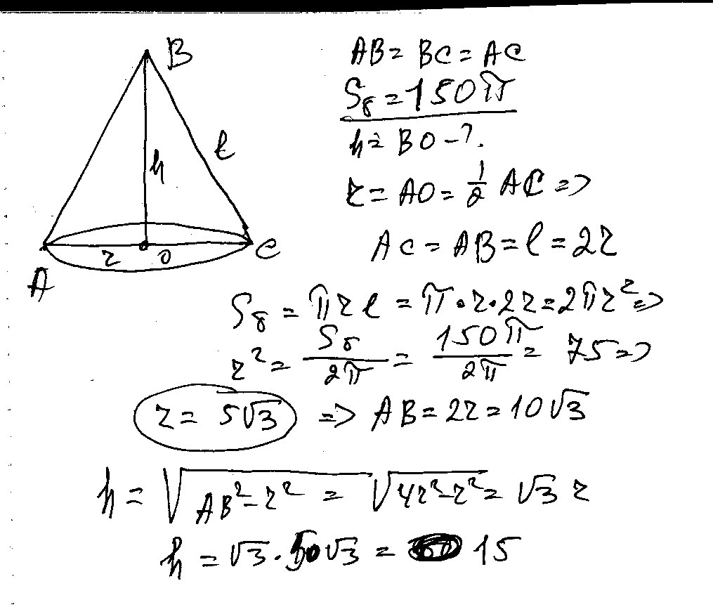 Образующая конуса равна диаметру основания. Найти высоту, если площадь его боковой поверхности равна 150п