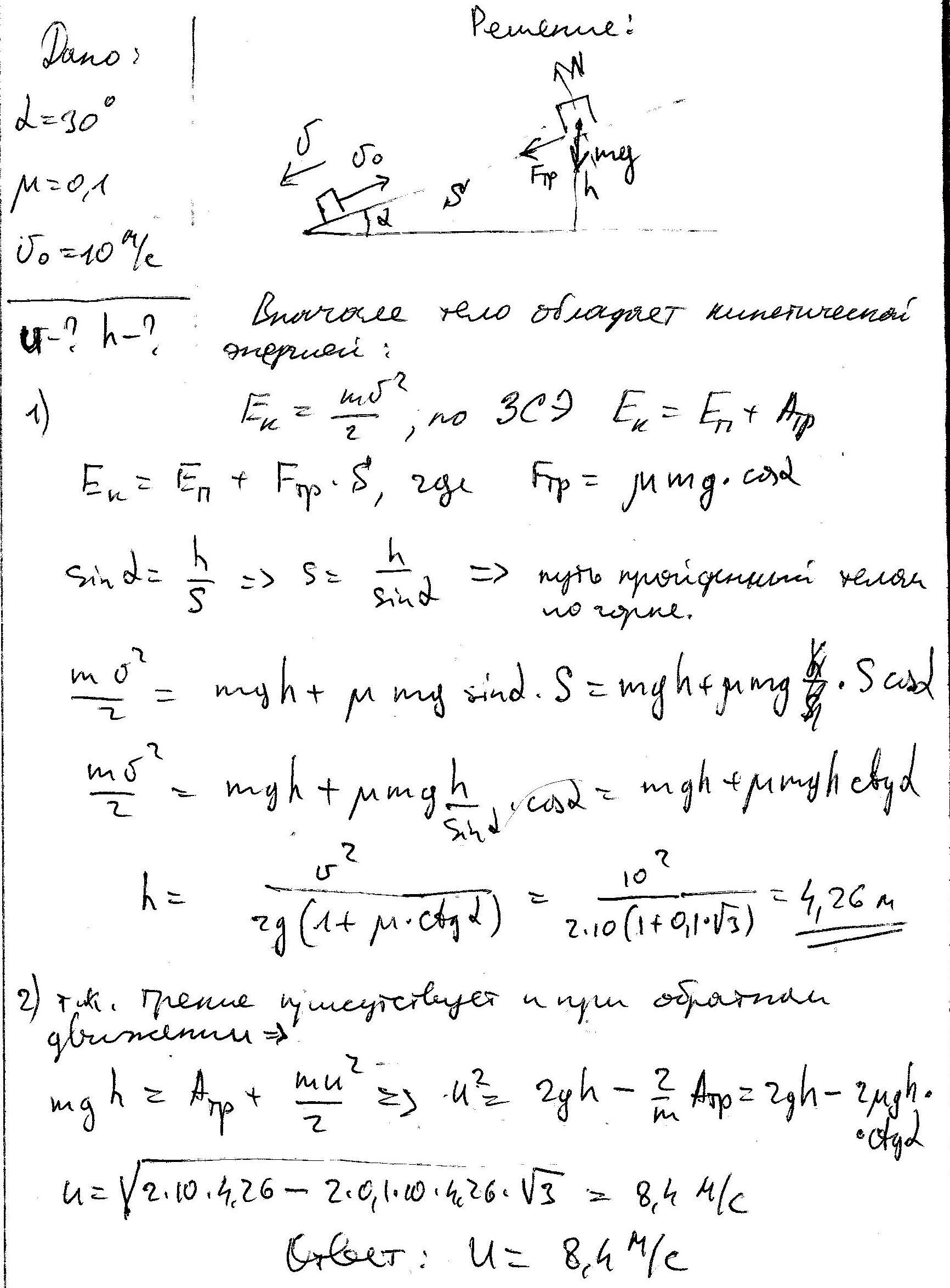 вверх движется тело с начальной скоростью 10 м/с; коэффициент трения скольжения 0,1.