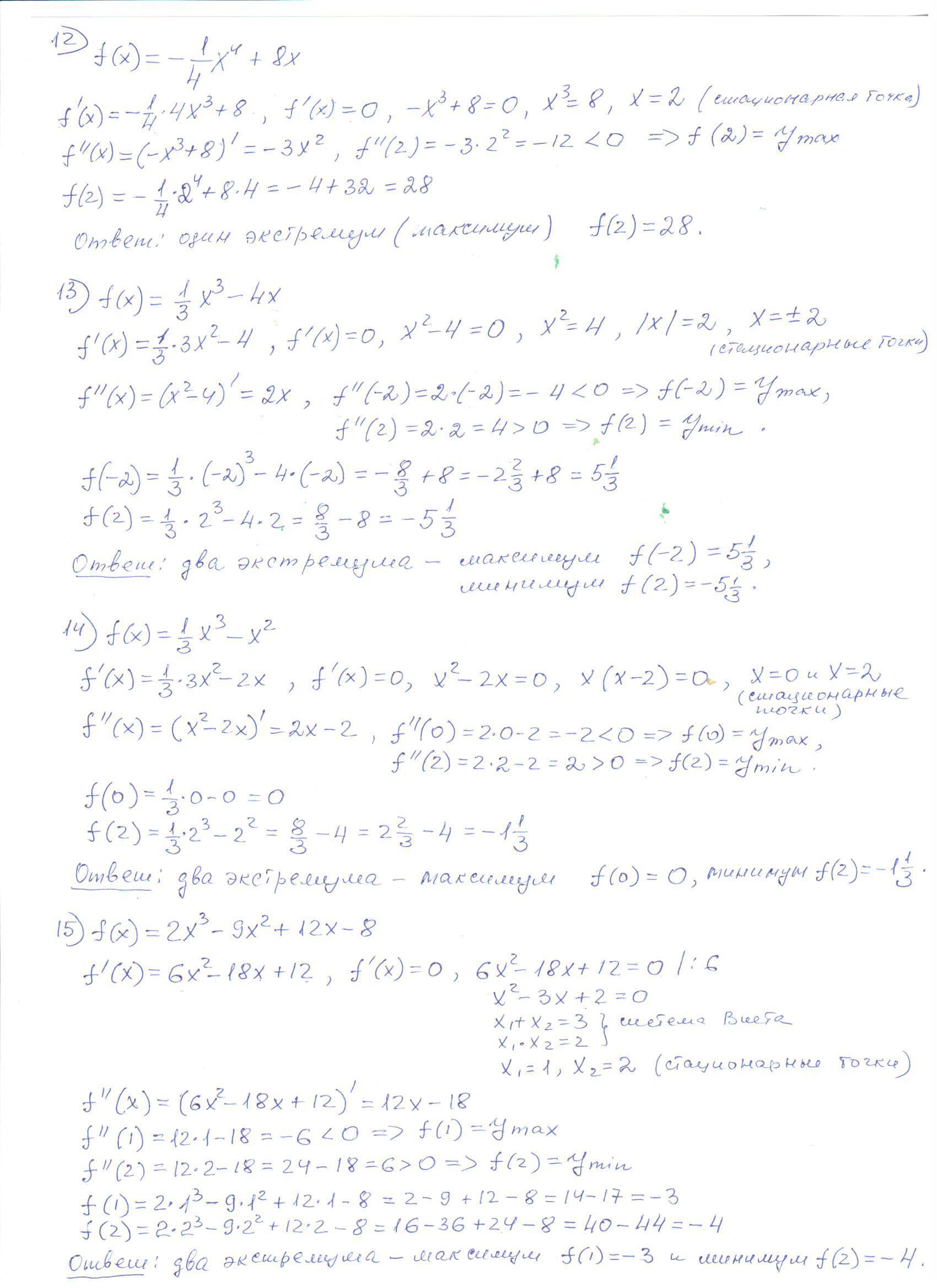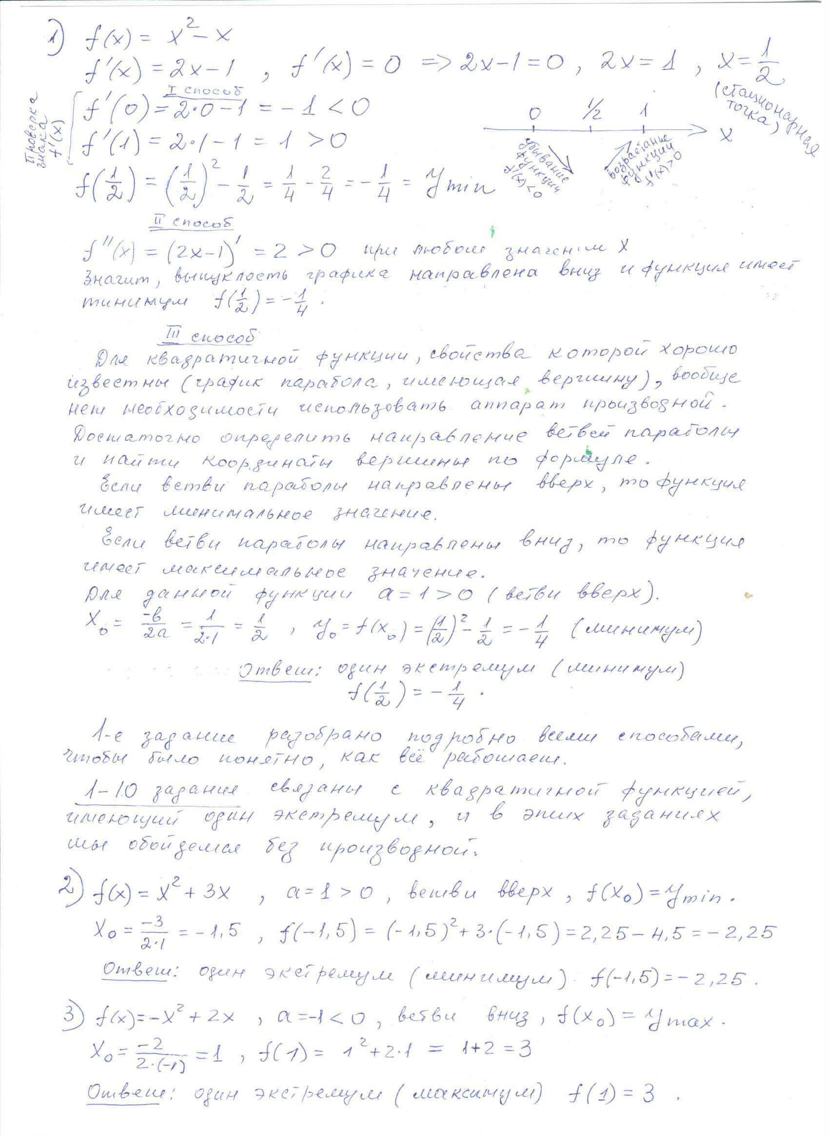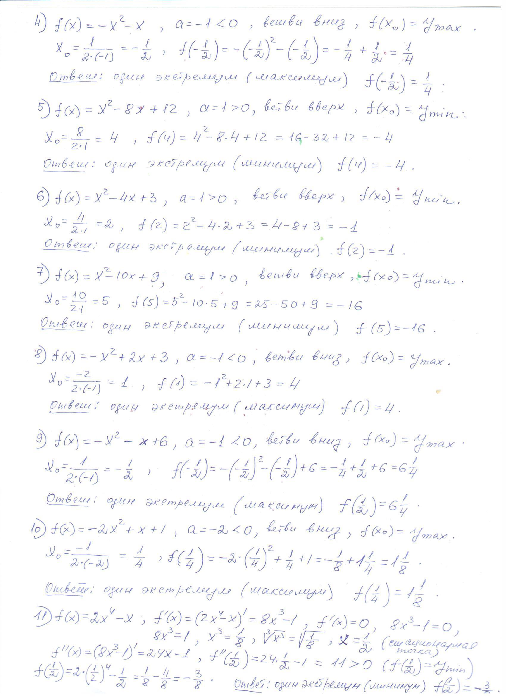 Решение в приложении. Я старалась сначала объяснить, как и что происходит с экстремумами. Очень много однотипных заданий. Будете разбираться с производными - проверяйте вычисления. Они очень простые, - но их было так много, что, возможно, где-то проскочила описка, просто от количества чисел. Удачи!
