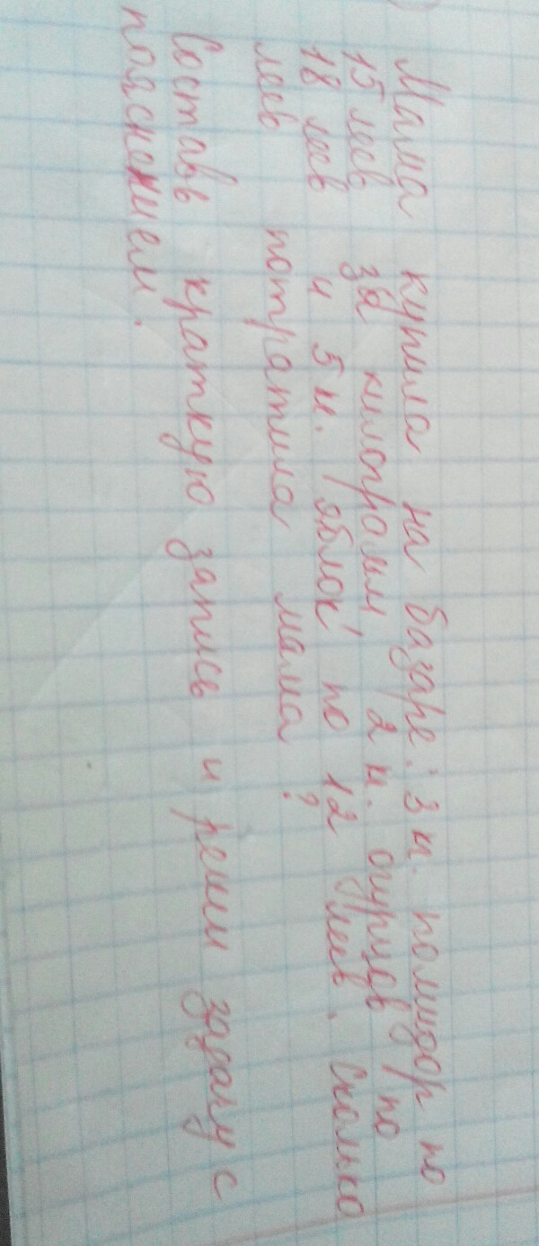 Мама купила на базаре 3 кг помидоров по 15 лет за килограмм 2 кг огурцов 18 лет 45 кг яблок от 12 леев сколько леев потратила мама Составь краткую запись и реши задачу с пояснением