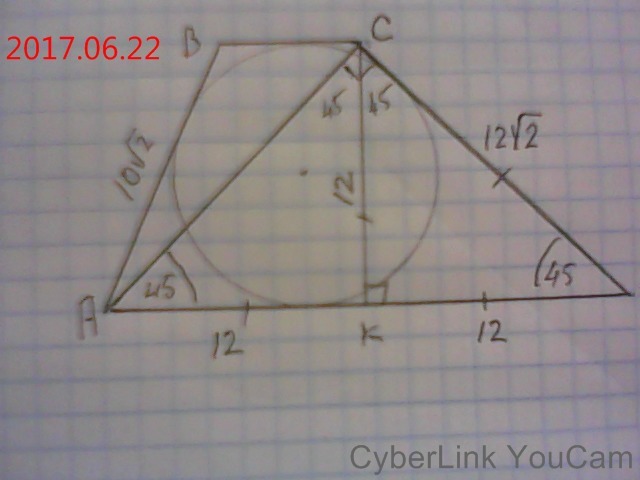 В трапецию АВСД вписана окружность с центром О и радиуса 6см, уголСАД=45 градусов, уголАСД=90 градусов.Найдите сумму ВС+АВ,если АВ=10корень из 2см.