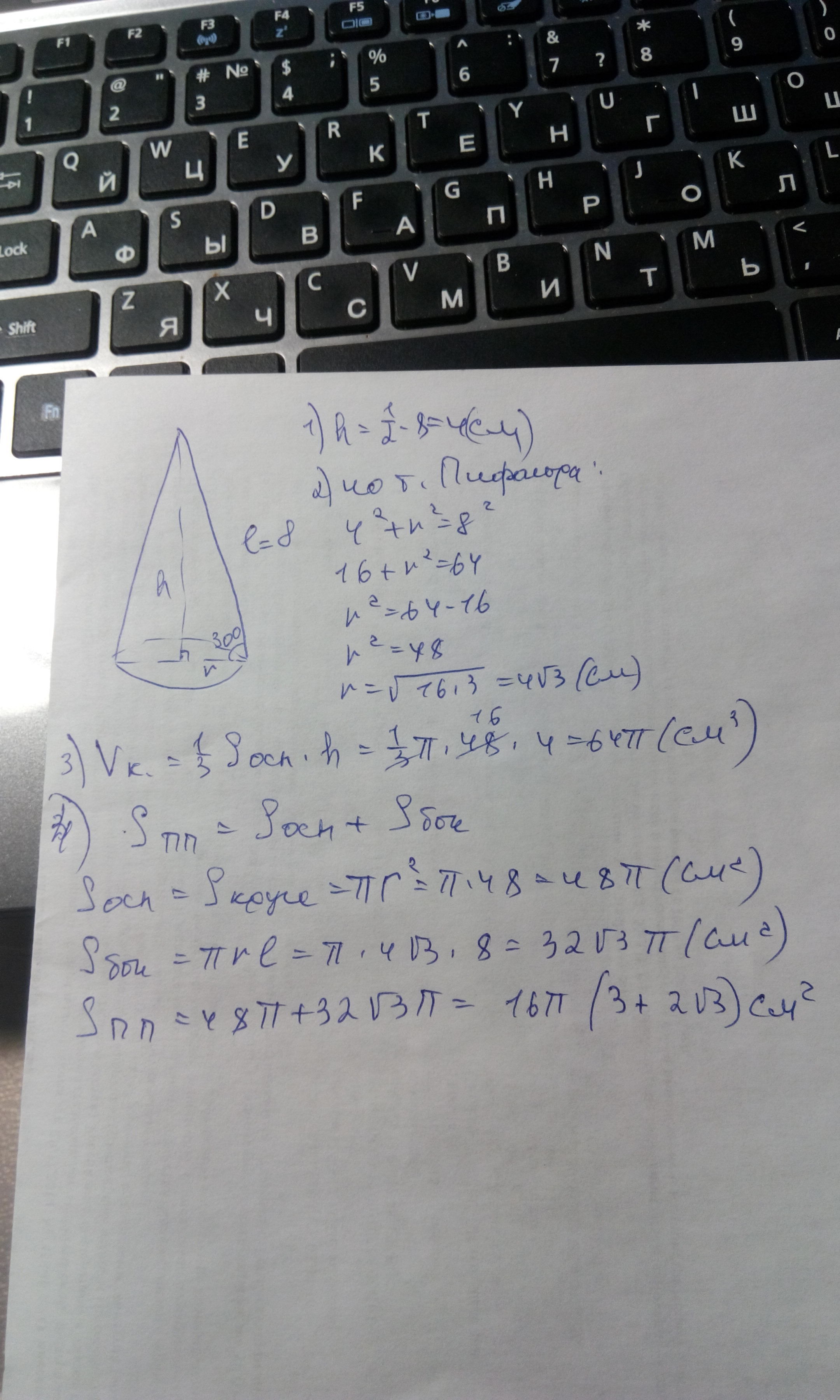 Образующая конуса равно 8 см и наклонена к его основанию под углом 30 градусов.Найдите площадь поверхности и объем конуса.