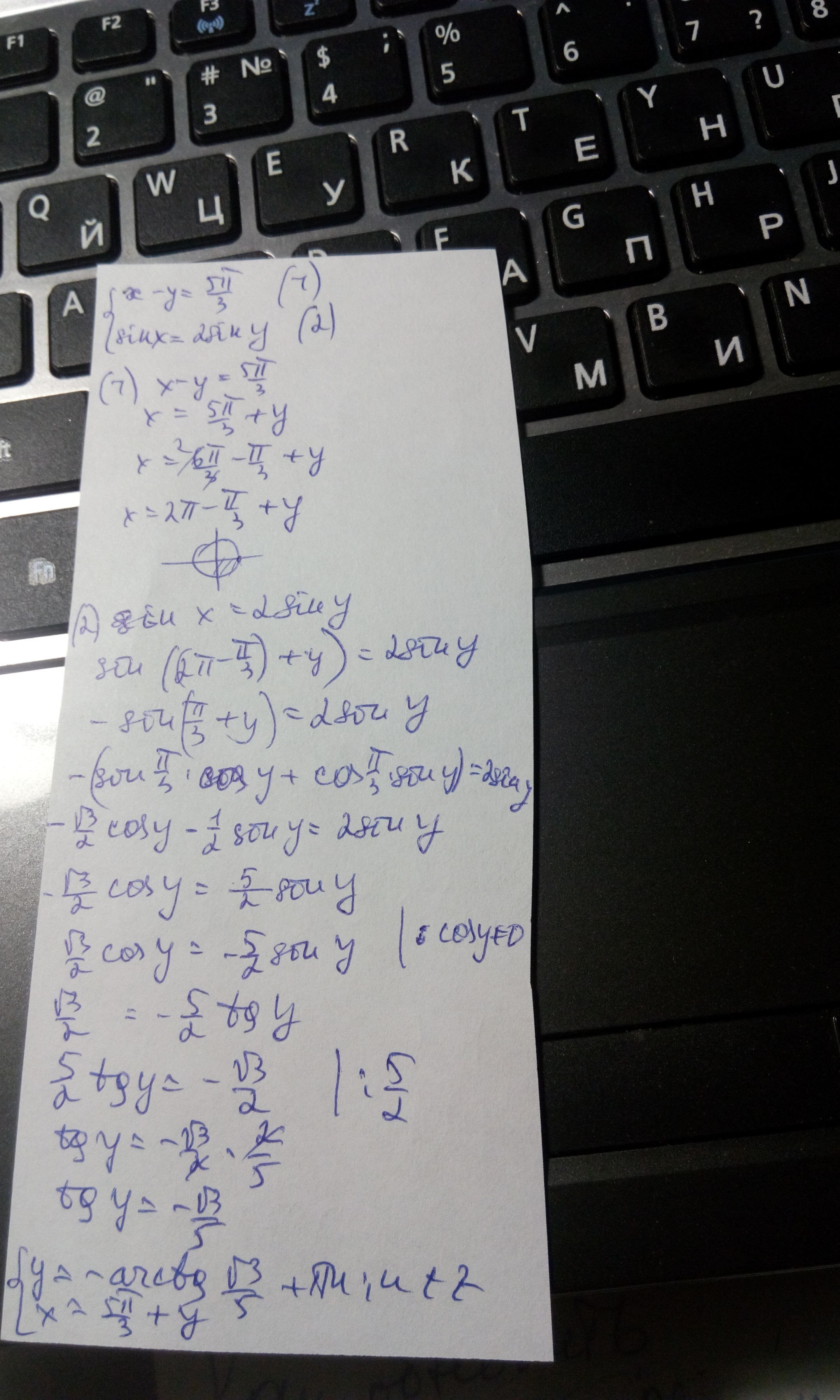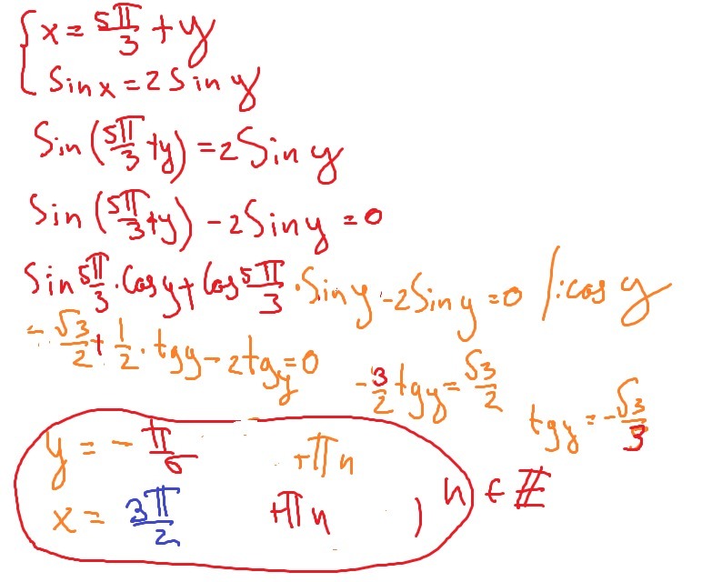 Решение дано на фото.Ответ :Х=5π/3-arc tg√3+πn;У=-arctg√3+πn;n∈Z