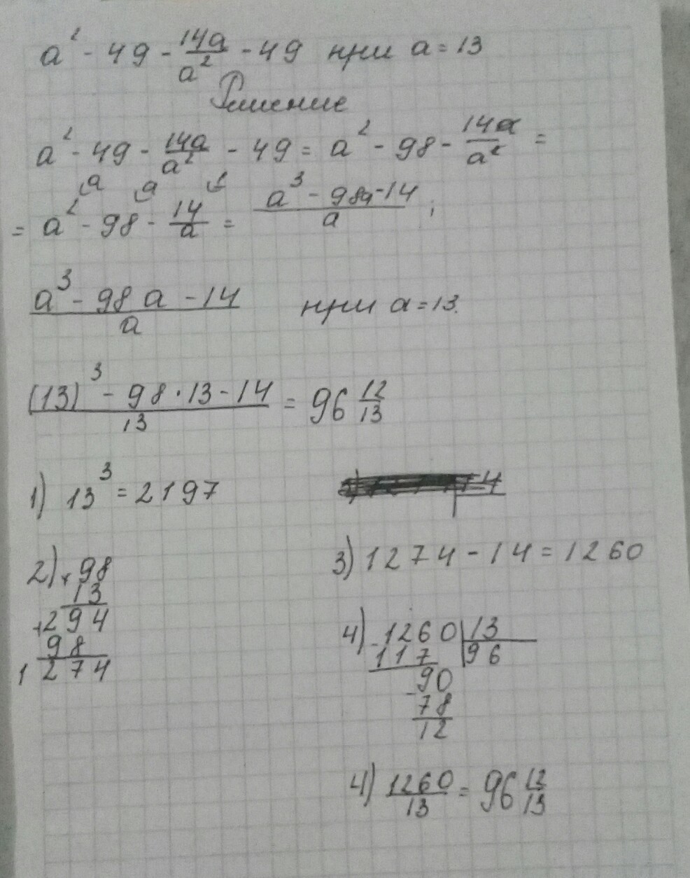 3. Сократите дробь а (в квадрате) + 49 - 14 а / а (в квадрате) - 49 и найдите ее значение при а = 13.