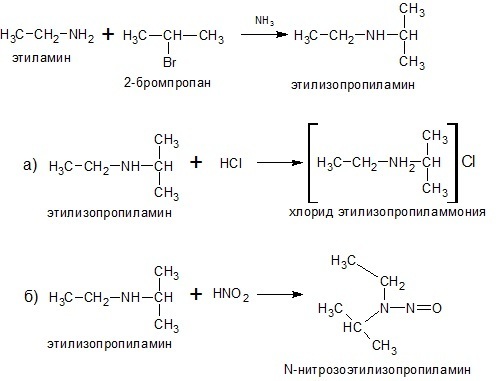 Из этиламина получить этилизопропиламин. Полученное соединение введите в реакцию: а) с хлороводородной кислотой; б) с азотистой кислотой