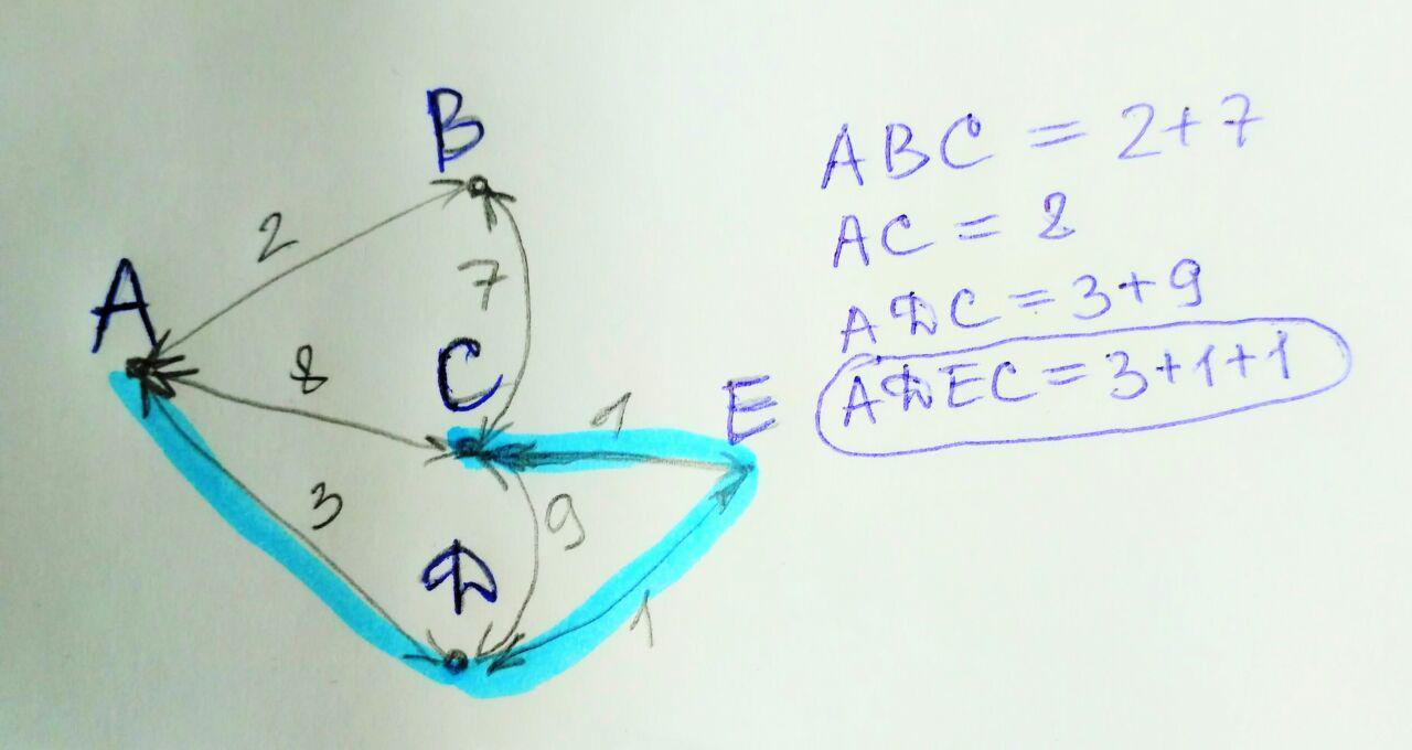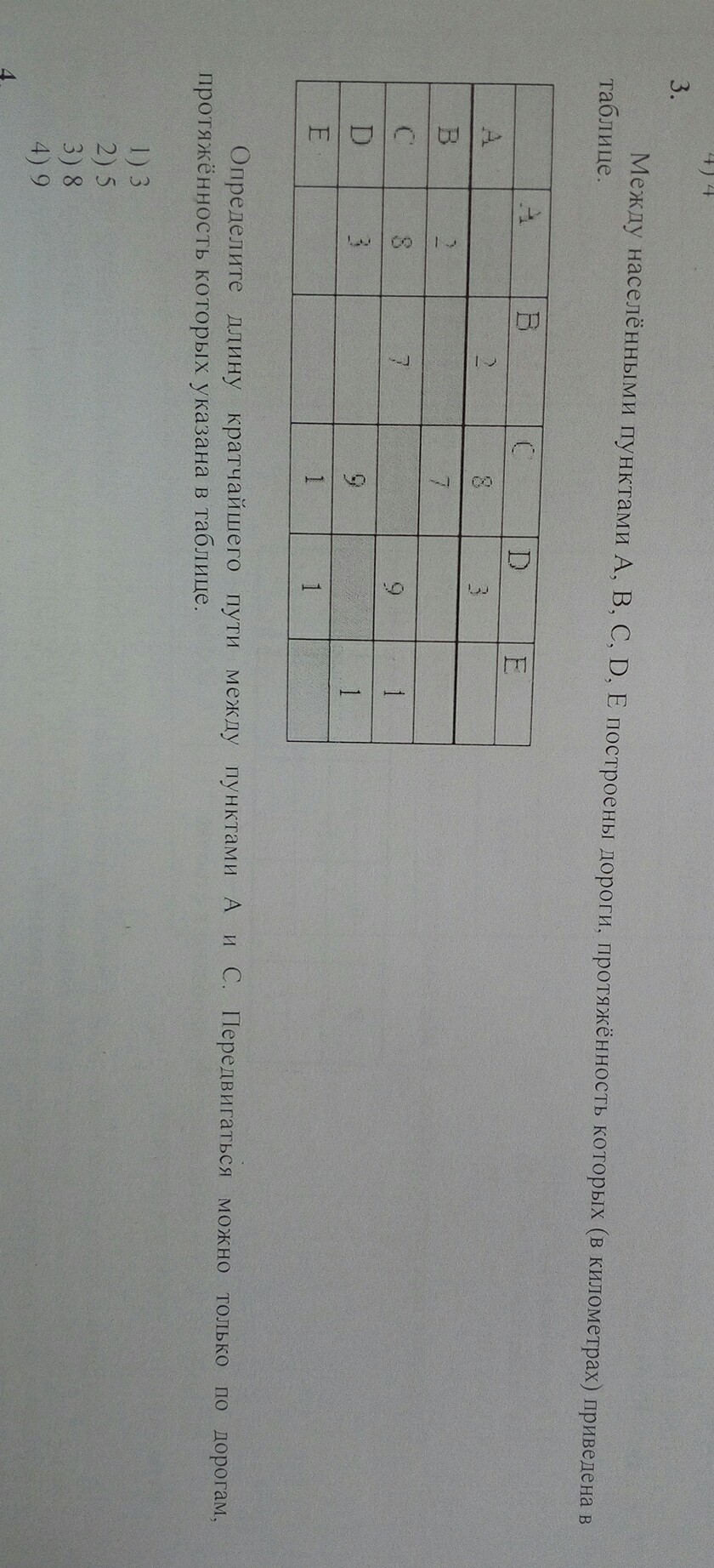 Между населенными пунктами A,B,C,D,E построены дороги , протяжённость которых ( в километрах ) приведена в таблице. Определитель длину кратчайшего пути между пунктами A и C.