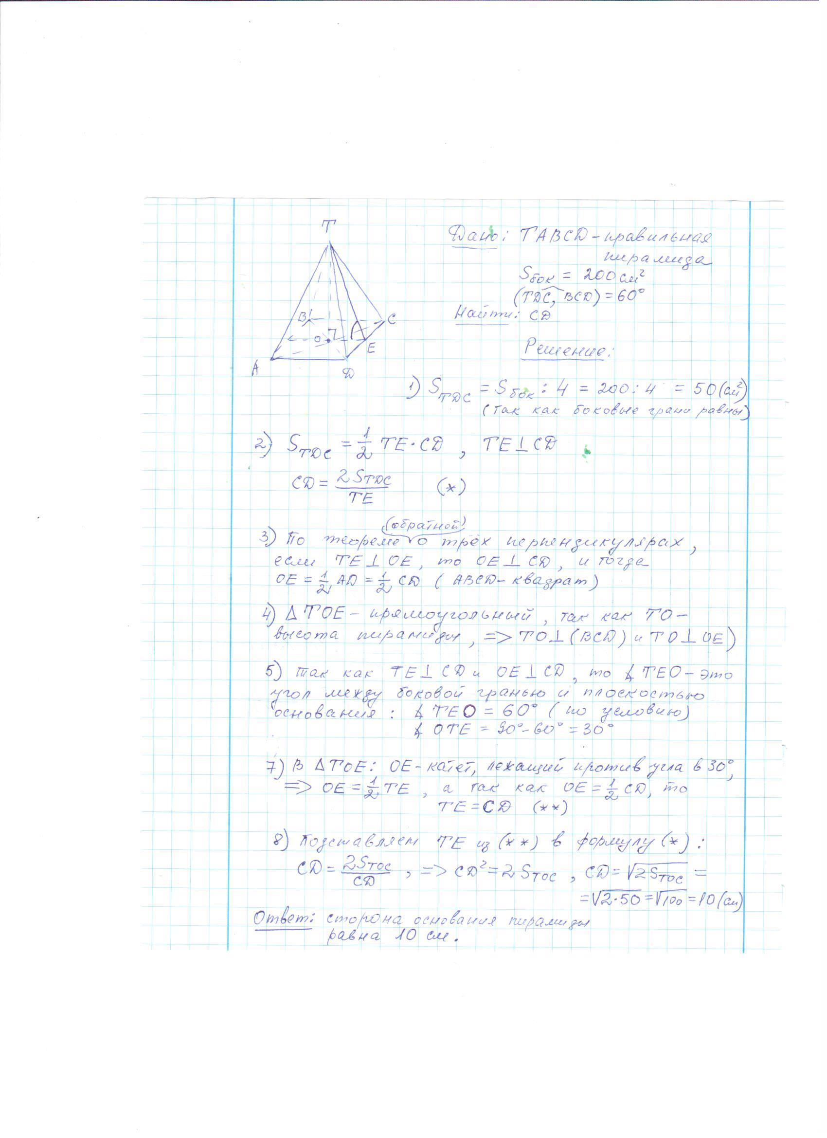 Площадь боковой поверхности правильной четырехугольной пирамиды = 200см^2. Боковая грань наклонена к плоскости основания под углом 60 градусов. Найти сторону основания пирамиды.