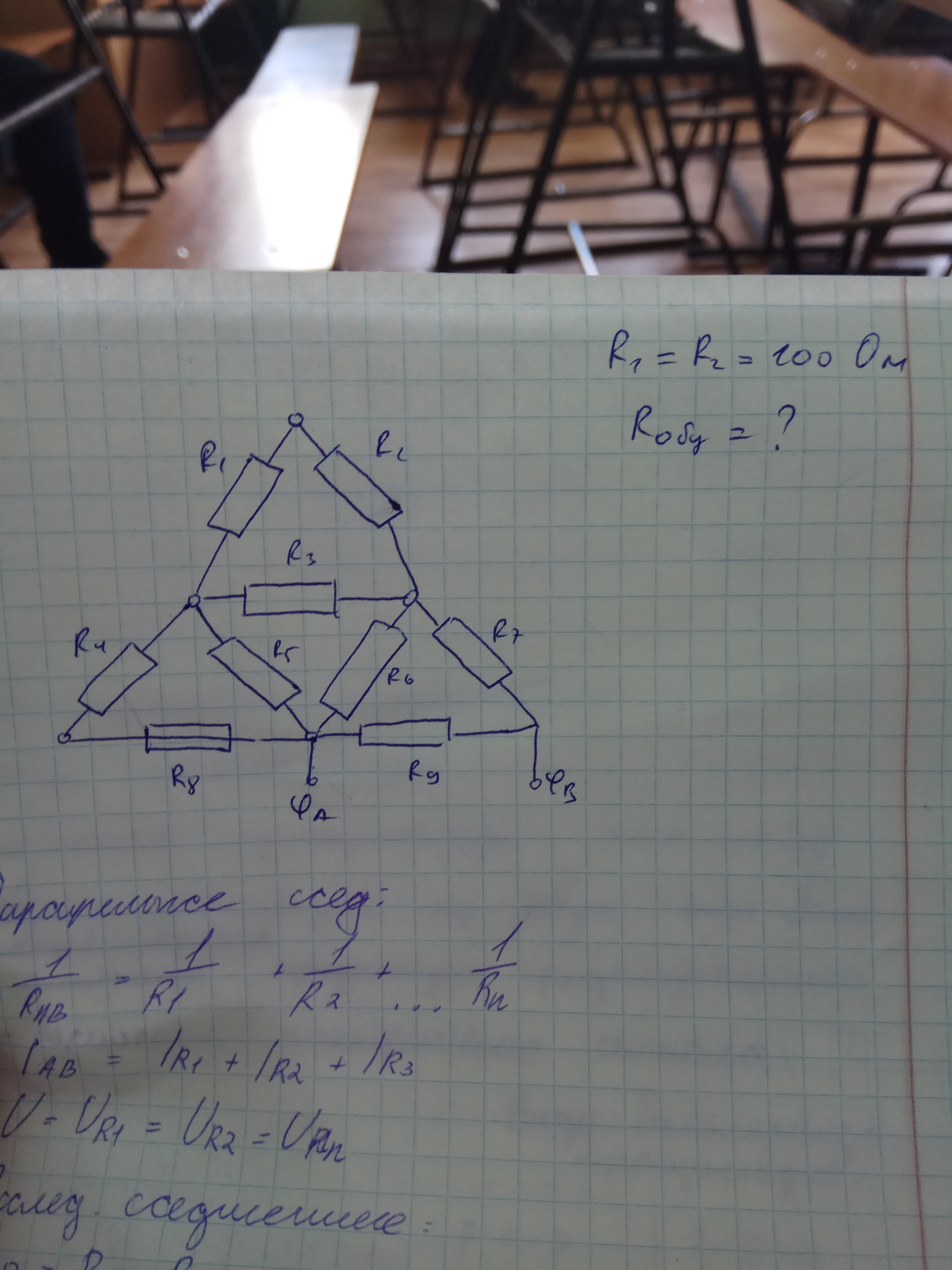 электротехника. Все резисторы 100 ом, надо найти общее. тут главное правильно определить где параллельное и последовательное соединение