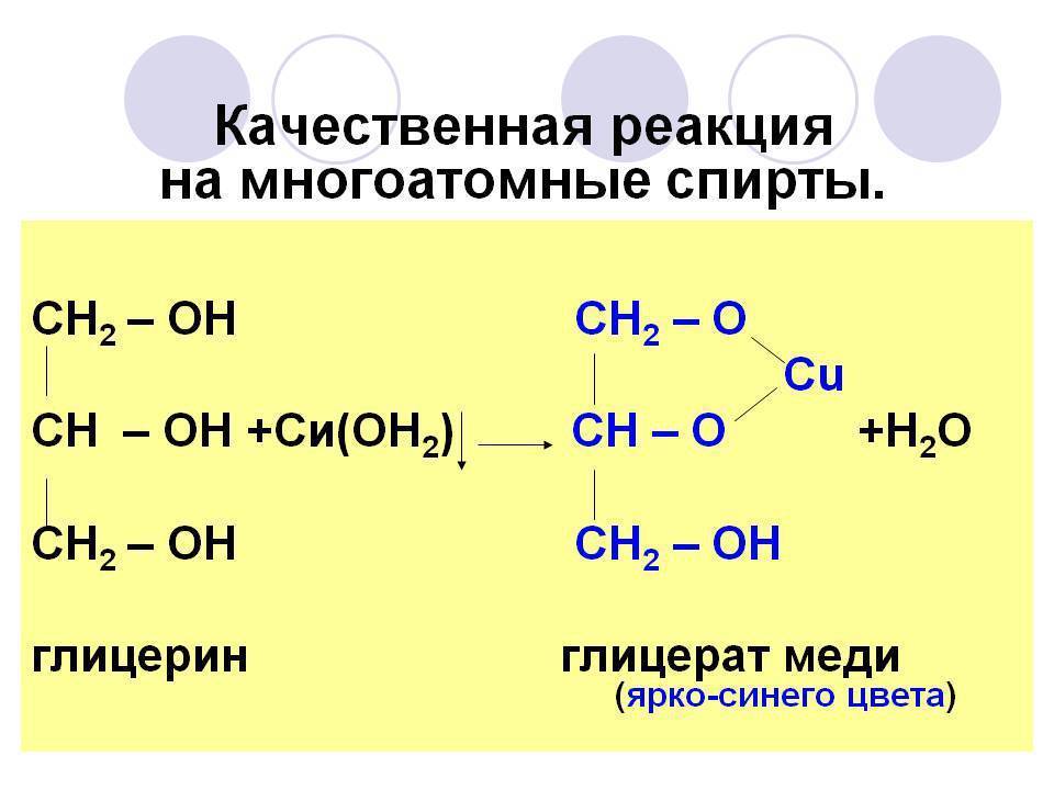 Есть такая качественная реакция на многоатомные спирты, реакция с гидроксидом меди 2. В результате реакции осадок растворяется и образуется ярко синий раствор, именно поэтому реакция является аналитической. Так же качественными являются реакции многоатомных спиртов с натрием (при этом произойдет выделение газа), и с перманганатом калия (обесцвечивание раствора).