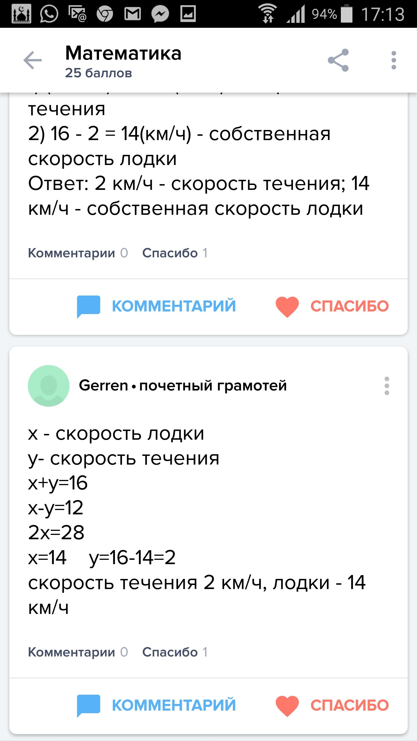 скорость течения 2 км/ч, лодки - 14 км/ч.о