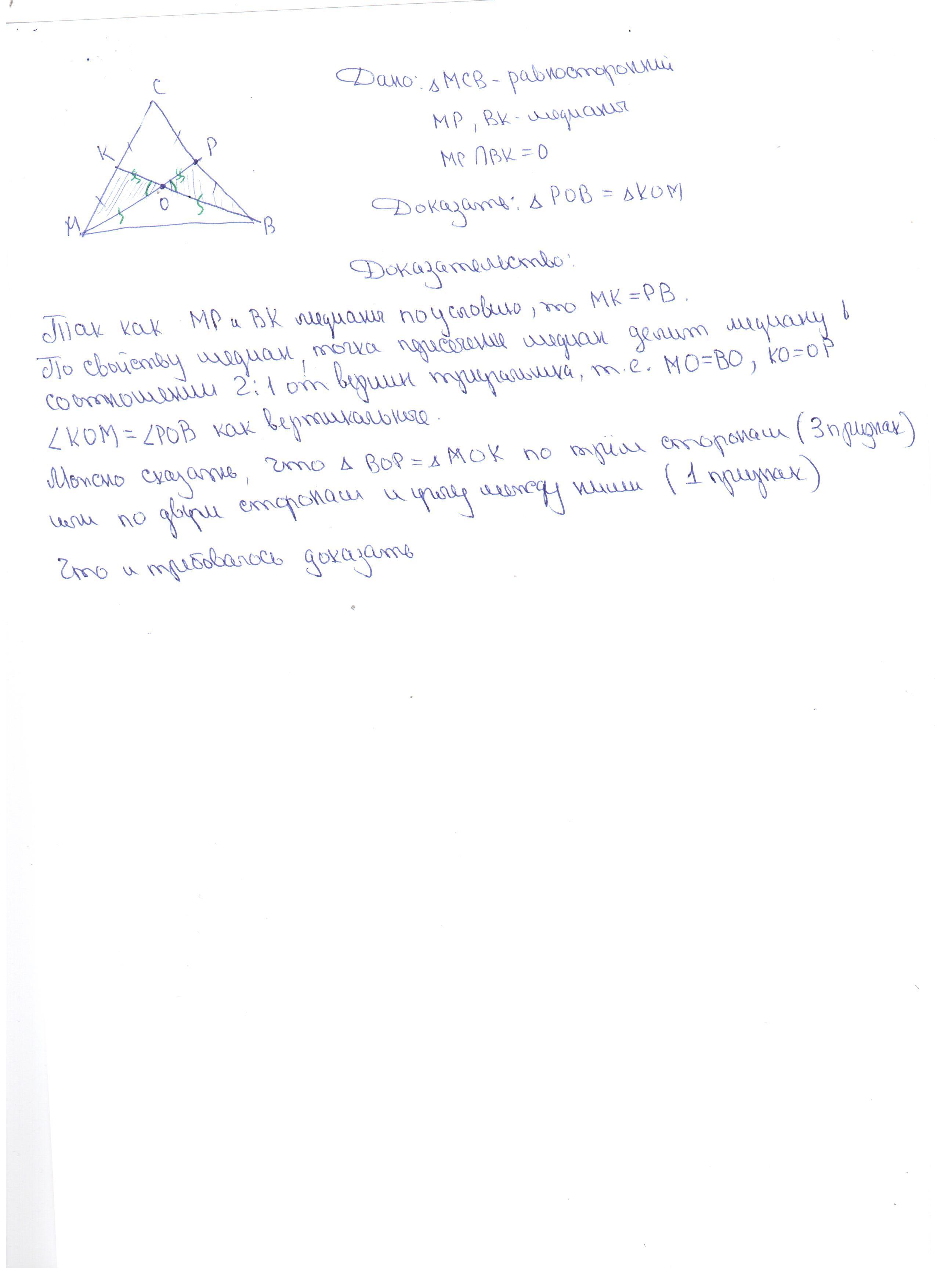 Треугольник МСВ - равносторонний, ВК и МР - его медианы, пересекающиеся в точке О. Докажите равенство треугольников ВОР и МОК
