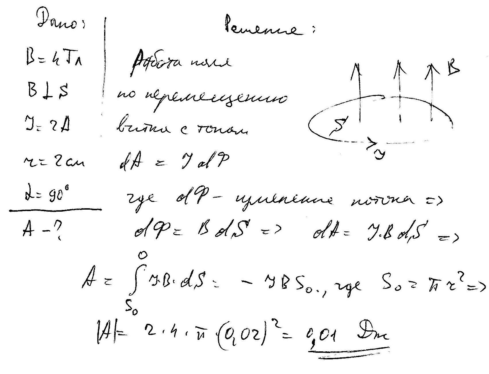 Круговой контур помещен в однородное магнитное поле с индукцией В=4 Тл так, что плоскость контура перпендикулярна силовым линиям поля. По контуру идет ток I=2 А, радиус r=2 см. Какую работу надо совершить, чтобы повернуть контур на 90° вокруг оси, совпадающей с диаметром контура?