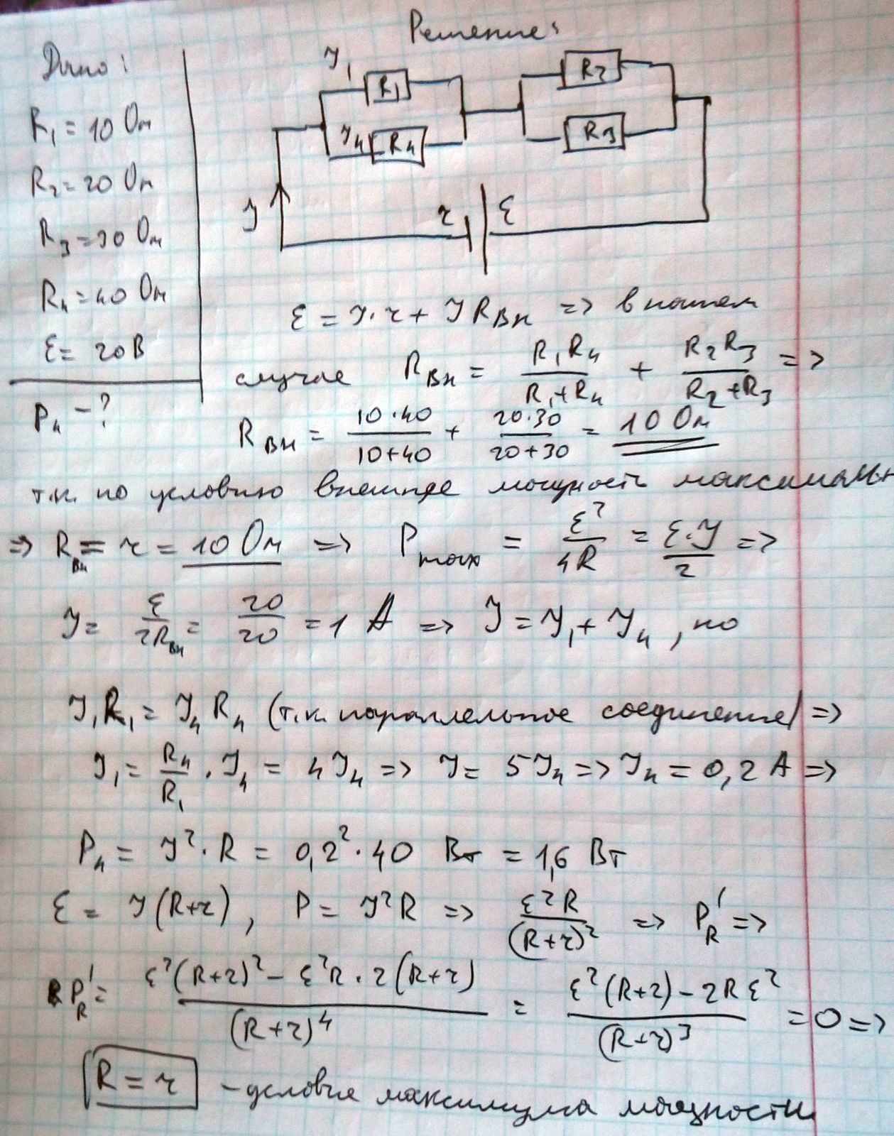 На участке цепи, состоящего из 4 резисторов сопротивлением R1=10 Ом R2 =20 Ом R3=30 Ом R4=40 Ом, подключённых к источнику тока, выделяется максимальная мощность. Если ЭДС источника Е=20 В, то мощность Р4, выделяемая в резисторе R4, равна ... мВт