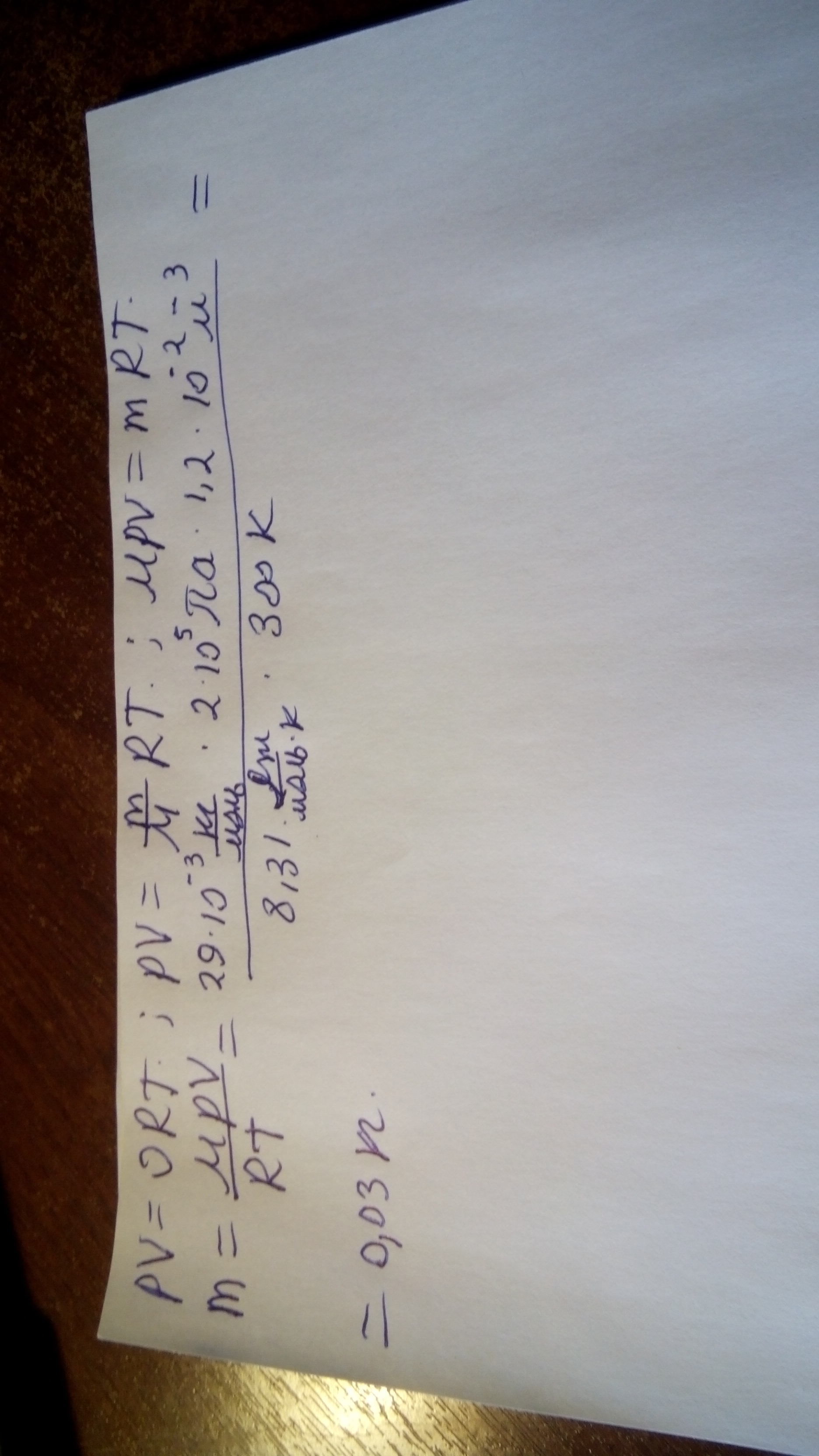 Нужна помощь, скоро экзамен: Объем камеры шины для легкового автомобиля 1.2 * 10^-2 м^3. Какая масса воздуха требуется для заполнения камеры до давления 2 * 10^5 Па при температуре 300 K? Молярная масса воздуха 29 * 10^-3 кг/моль.