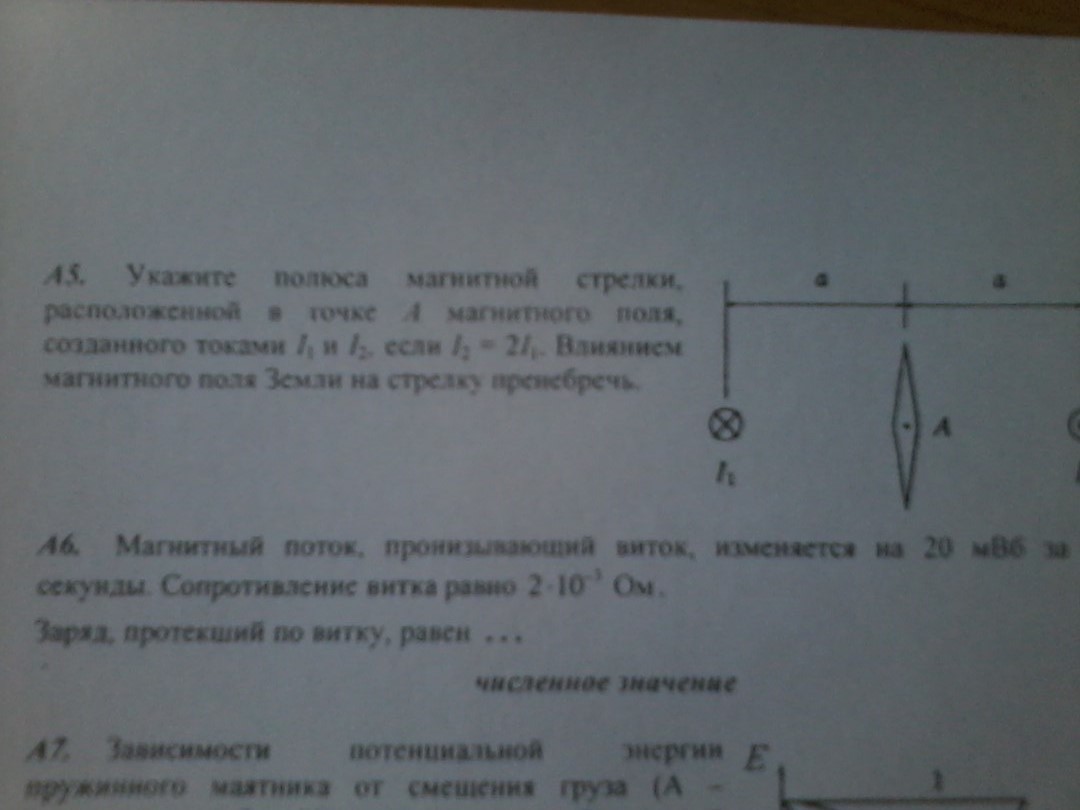 Северный полюс - вверху, южный - внизу- это следует из того, что в точке А суммарная магнитная индукция полей токов направлена вверх.