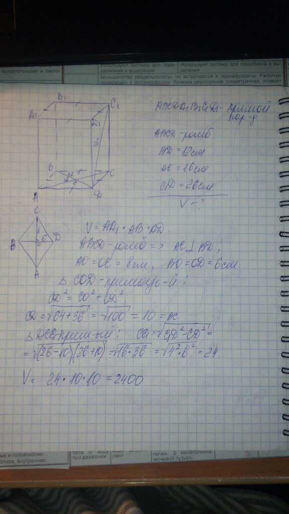 Основание прямого параллелепипеда ромб с диагоналями 12 см и 16 см.Диагональ боковой грани равна 26 см.Найти объём параллелепипеда.
