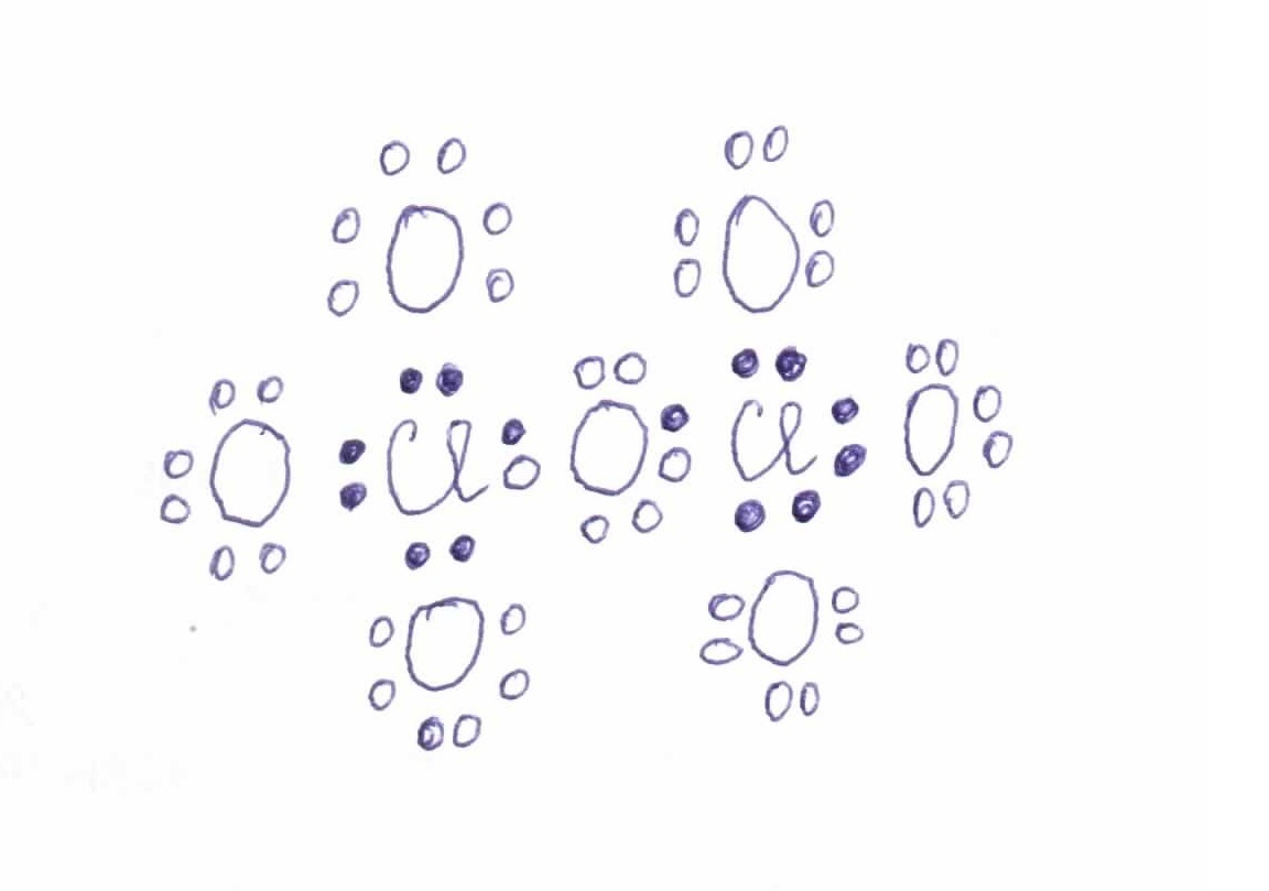 У кислорода теперь полностью заполненная 8-электронная оболочка (октет). А у хлора еще 5 свободных электронов. Отдавая их еще 3 атомам кислорода, хлор также получает октет: