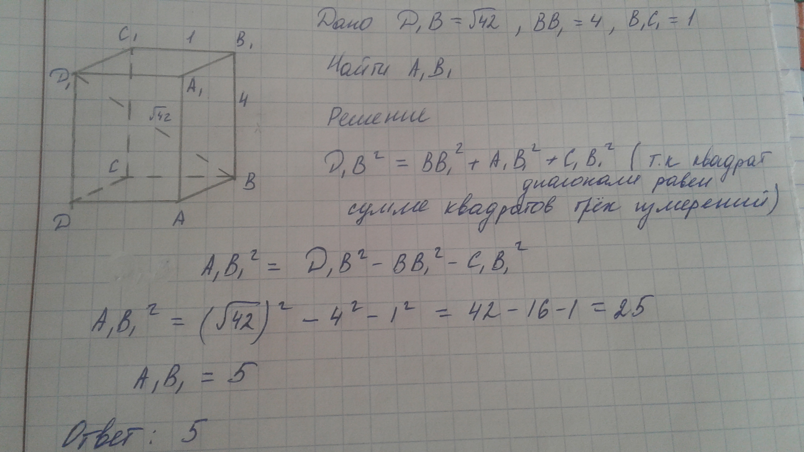 В прямоугольном параллелепипеде АВСДА1В1С1Д1,известно,что Д1В =√42,ВВ1=4,В1С1=1.Найдите длину ребра А1В1