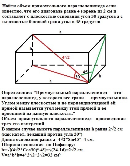 найти объем прямоугольного параллелепипеда если известно, что его диагональ равна 4 корень из 2 см и составляет с плоскостью основания угол 30 градусов а с плоскостью боковой грани угол в 45 градусов