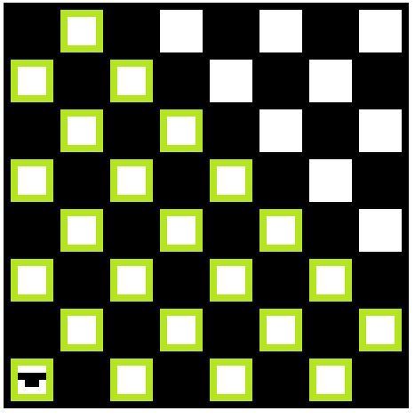 вот, здесь зелёным помечены клетки, где возможно встанет ладья на 8-ой ход. На моём рисунке обязательно это будет белая клетка, потому что когда 8 ходов делаешь, цвет клеток на которые ладья встаёт - чередуется. Поэтому 8-ым будет белая клетка. Ну а предельная "досягаемость" ладьи в нашем случае за 8 ходов будет лежать по белой диагонали