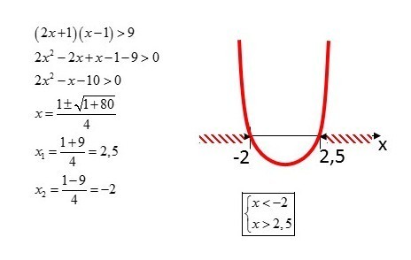 Ответ: От минус бесконечности до -2 и от 5/2 до плюс бесконечности