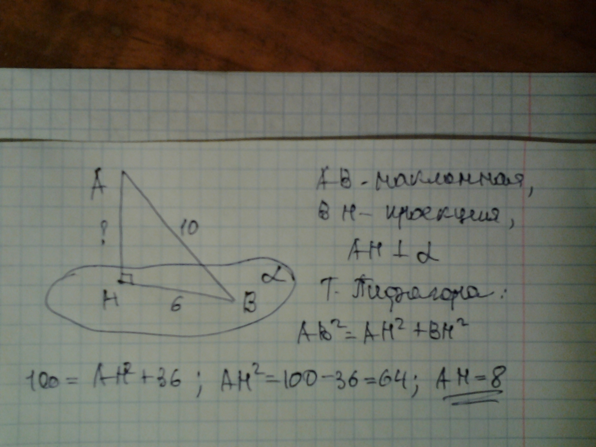 От точки A до плоскости альфа проведены наклонную длиной 10 см, проекция наклонной на эту плоскость равна 6 см. Найти расстояние от точки A до плоскости альфа.