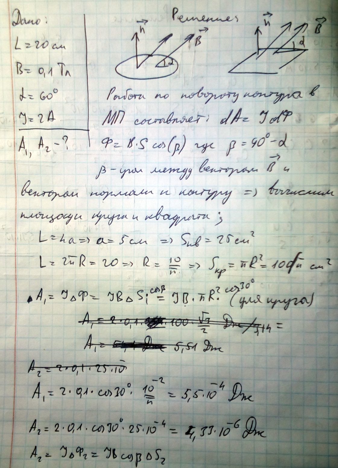 Из проволоки длиной L=20 см сделаны квадратный и круговой контуры. Контуры помещены в однородное магнитное поле с индукцией В=0,1 Тл. Плоскость каждого контура составляет угол 60 градусов с линиями магнитной индукции. Какую работу надо совершить, чтобы повернуть эти контуры параллельно линиям магнитной индукции, если по каждому контуру течет ток I=2A?