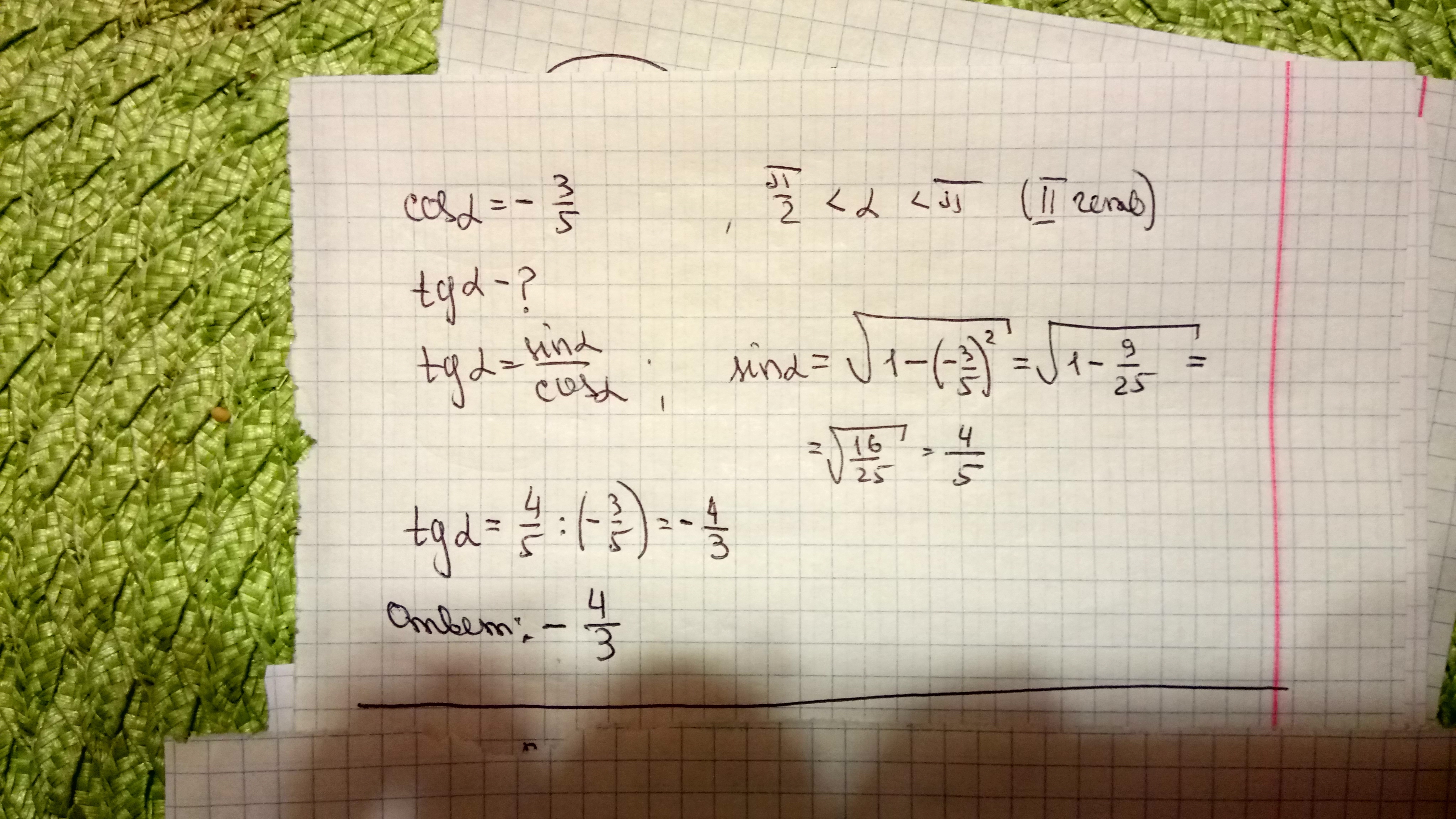 tgα = Sinα/Cosα = 4/5 : (-3/5) = -4/3