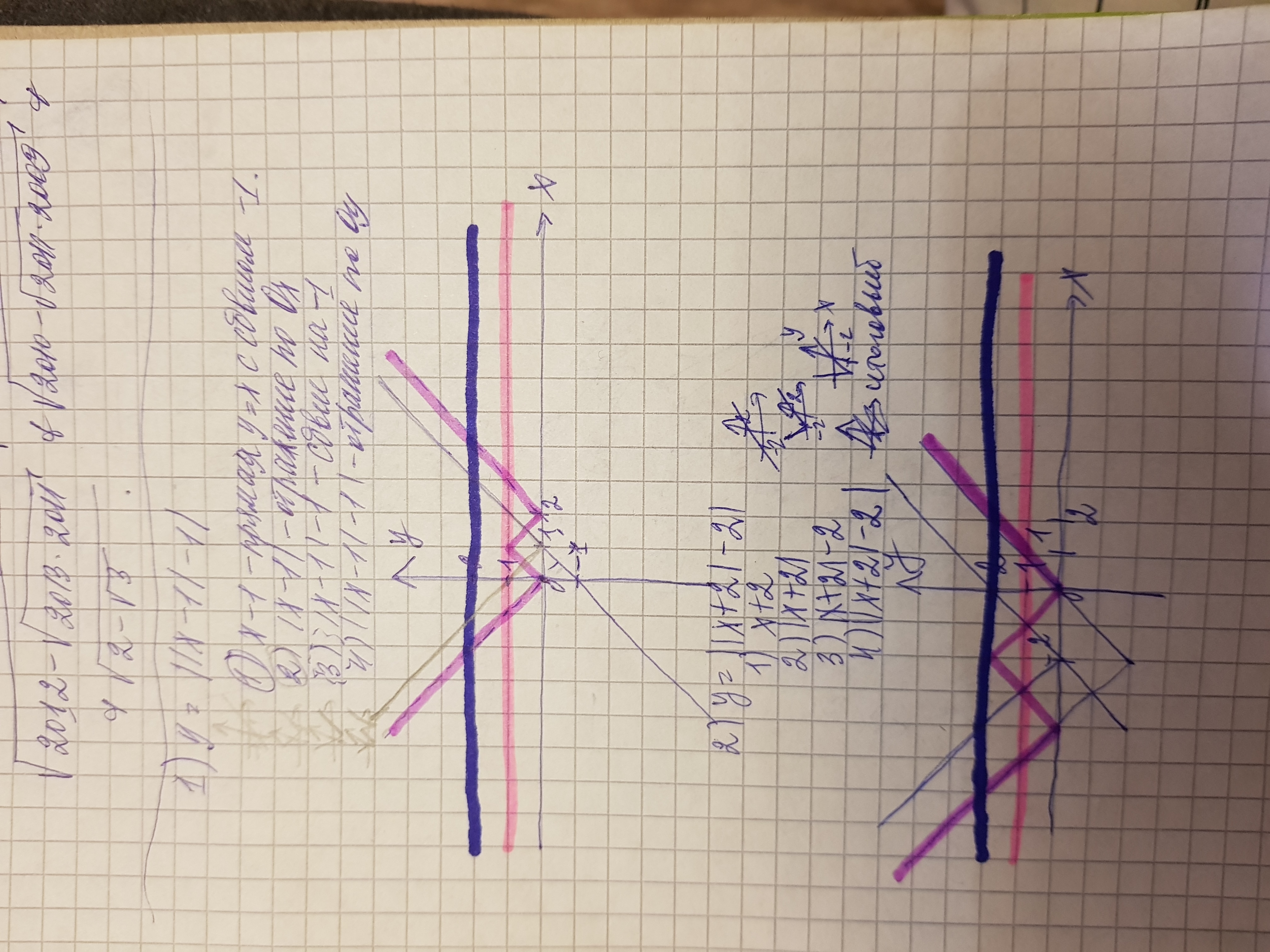 1) Фиолетовым указан итоговый график (рядом с каждым пунктом очень мелко и схематично указано, что должно получиться на этом этапе), розовым - y = 1, синим - у = 2.
