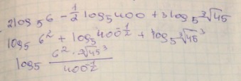 log(5)6²-log(5)√400+log(5)∛45³=log(5)36-log(5)20+log(5)45=