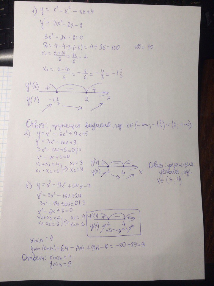 3) Найдите минимум функции y=x^3-9x^2+24x-7