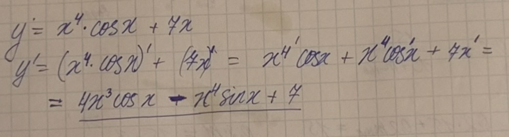 Производную находим по правилам дифференцирования. Ответ 4x^3cosx - x^4sinx + 7