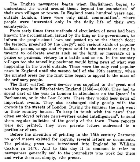 The printing press was ... in Germany in the 15th century. Today we often ... to newspapers and to journalists as «the press». But the earliest attempts to ... news were made in Rome. The first official newspaper was ... in Venice. In that time it was called ... a name which we use today.