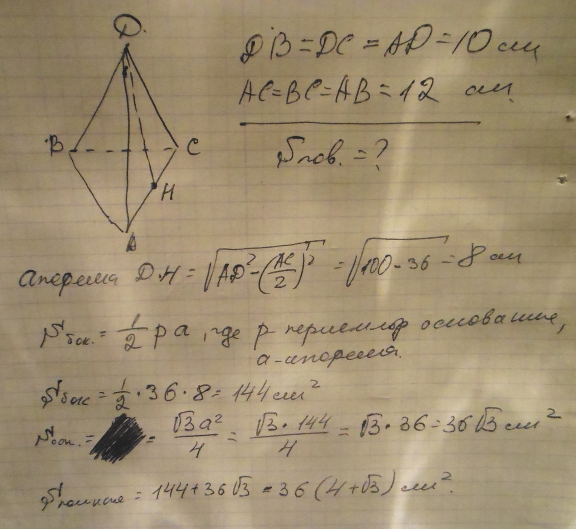 В правильной треугольной пирамиде боковое ребро равно 10 см,а сторона основания 12 см. Найдите площадь полной поверхности пирамиды.