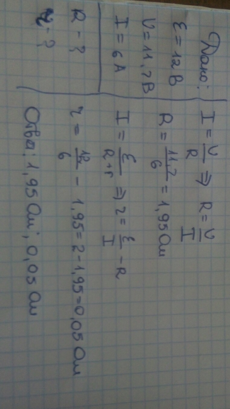 ЭДС батареи 12 В, а напряжение на её зажимах 11,7 В. Сила тока цепи 6 А.