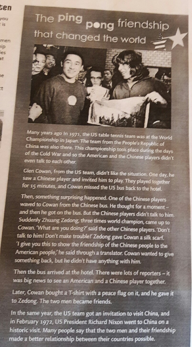 много лет назад в 1971 г. команда штатов по пинг понгу пребывала на чемпионате мира в Японии. Сборная КНР таакже была там.Этот чемпионат состоялся со времен холодной войны, поэтому амер. и китайские игроки даже не разговаривали друг с другом. Американскому игроку Глену Ковэну все это не нравилось и однажды увидев китайского спортсмена, он пригласил его сыграть партию. Они играли 15 минут и Ковэн опоздал на автобус, следовавший в отель. Потом случилось нечто необыкновенное. Один их китайских игроков помахал ему из автобуса. Ковэн задумался на мгновенье и забрался в их автобус. Как и следовало ожидать, китайцы не стали с ним общаться. Внезапно Джуанг Зедонг 3-х кратный чемпион мира подошел к Ковэну. Что ты делаешь? сказал один из игроков. Не разговаривай с ним, не создавай преблем. Джуанг Зедонг протянул Ковэну шелковый шарф со словами Даю тебе этот шарф, чтобы показать дружеское отношение народа Китая к американцам. Ковэн захотел дать что нибудь в ответ, но у него не было ничего с собой. Потом автобус прибыль в отель. Там было невероятное количество репортеров - нахождение китайского и амер. игроков вызвало невероятный ажиотаж. Уже позже Ковэн купил футболку с изображением флага мира и подарил ее Зедонгу. Мужчины стали друзьями. В этом же году США получили приглашение посетить Китай и в феврале 1972 президент США Ричард Никсон отправился в Китай с историческим визитом. Многие говорили что дружба этих двух мужчин установила лучшие отношения между их странами.