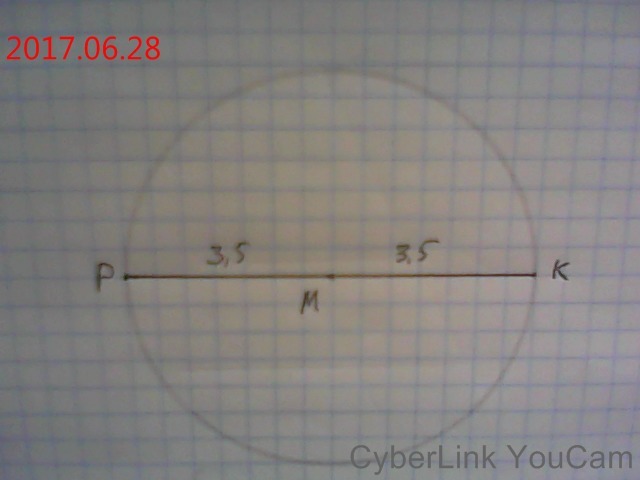 Начертите окружность с центром в точке M и радиусом 3см 5мм. Отметьте на ней точку K. Постройте на окружности точку P, удалённую от точки K на 7см.