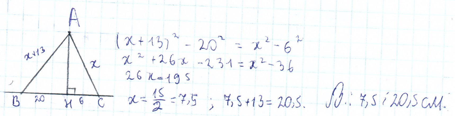 З точки до площиною, проведено дві похилі. Знайдіть довжини похилих, якщо одна з них на 13 см більша другої, а проекції похилих на площину дорівнюють 6 і 20 см.