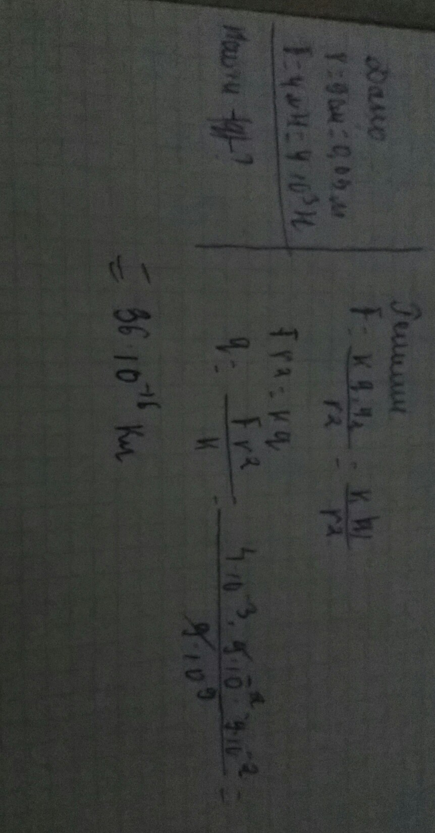 два разноименные равных по модулю заряды, которые находятся на расстоянии 9 см друг от друга, притягиваются с силой 4 мН. Определить модули этих зарядов.