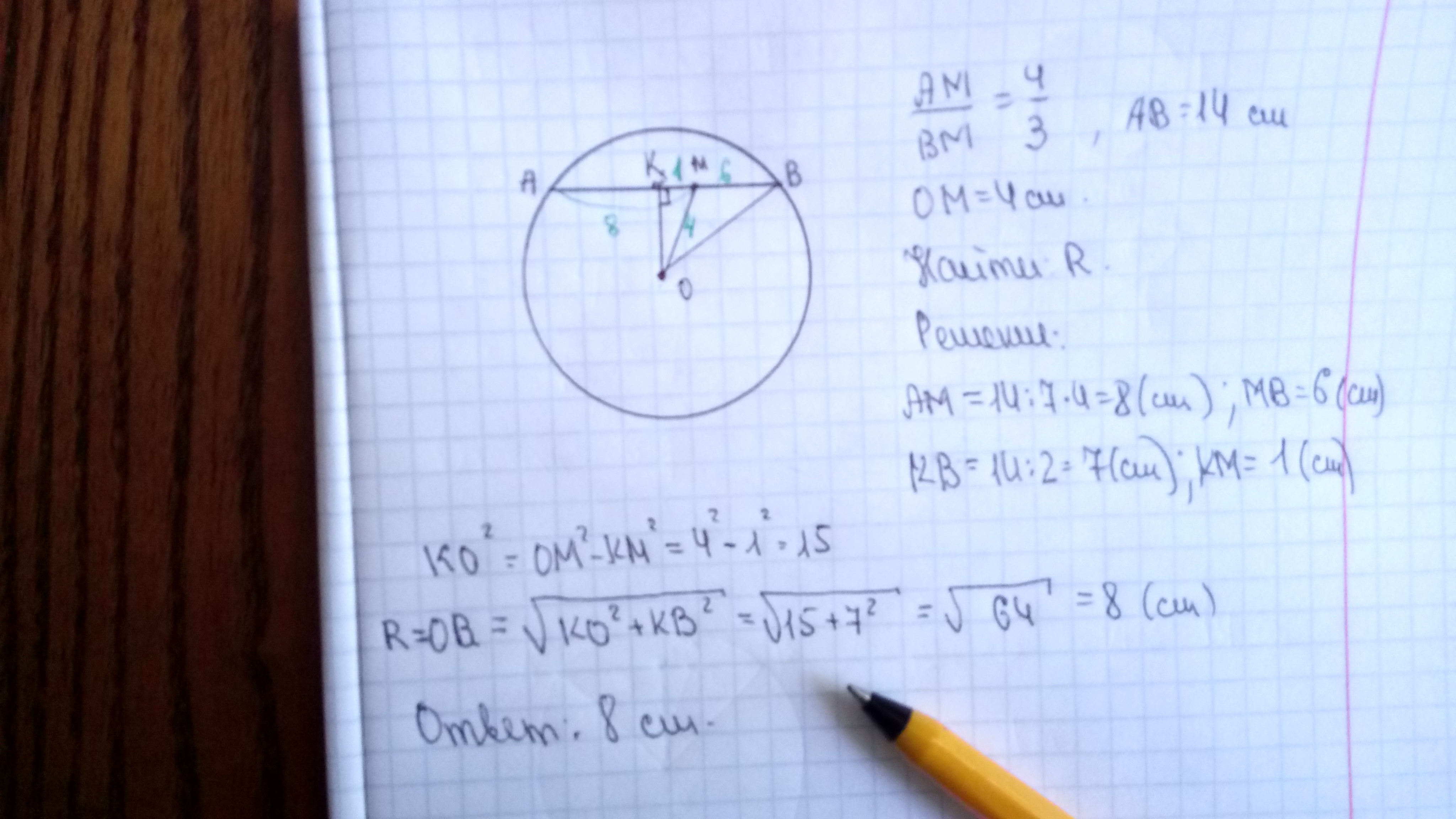 Точка М лежит на хорде АВ так, что АМ:В М=4:3, АВ=14. Расстояние от центра окружности до точки М равно 4 см.Найдите радиус окружности