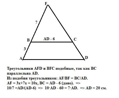 Продолжения боковых сторон AB и CD трапеции ABCD пересекаются в точке F. AB:BF=3:7. AD- большее основание трапеции. Разница оснований трапеции равно 6 см. Найти основание AD.