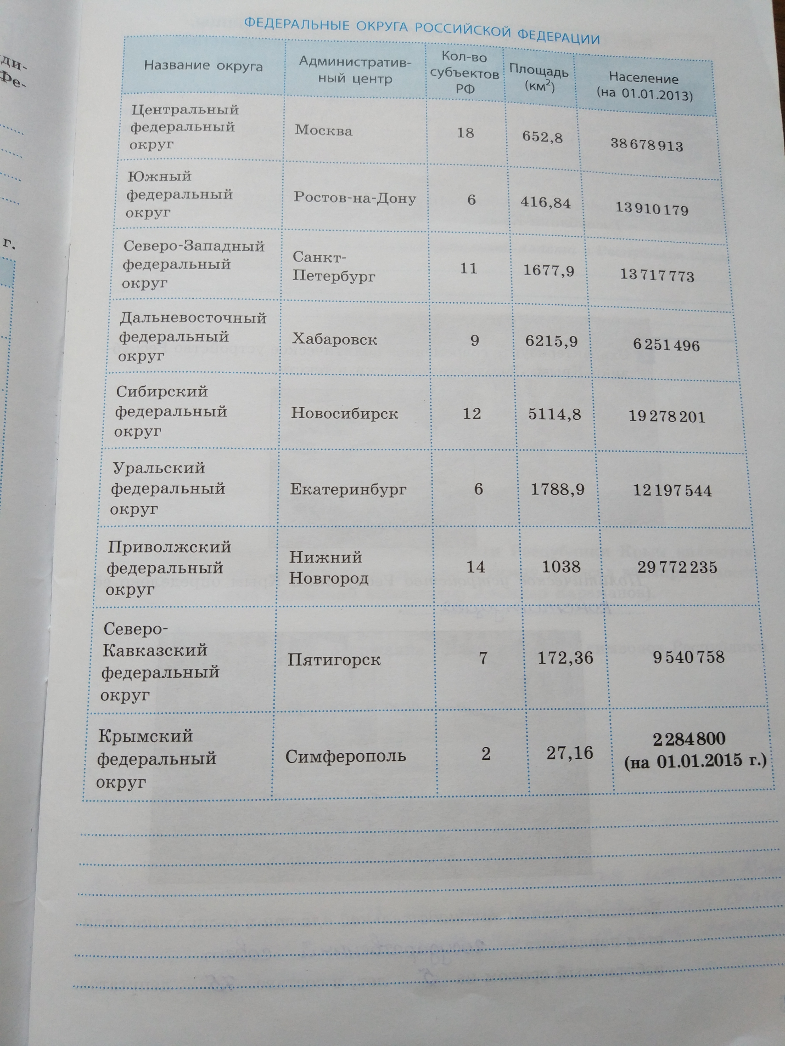 Проанализируйте статистические данные таблицы "федеральные округа рф " , расчитай плотность населения в различных федеральных округах и сравните эти показания с Крымским федеральным округом