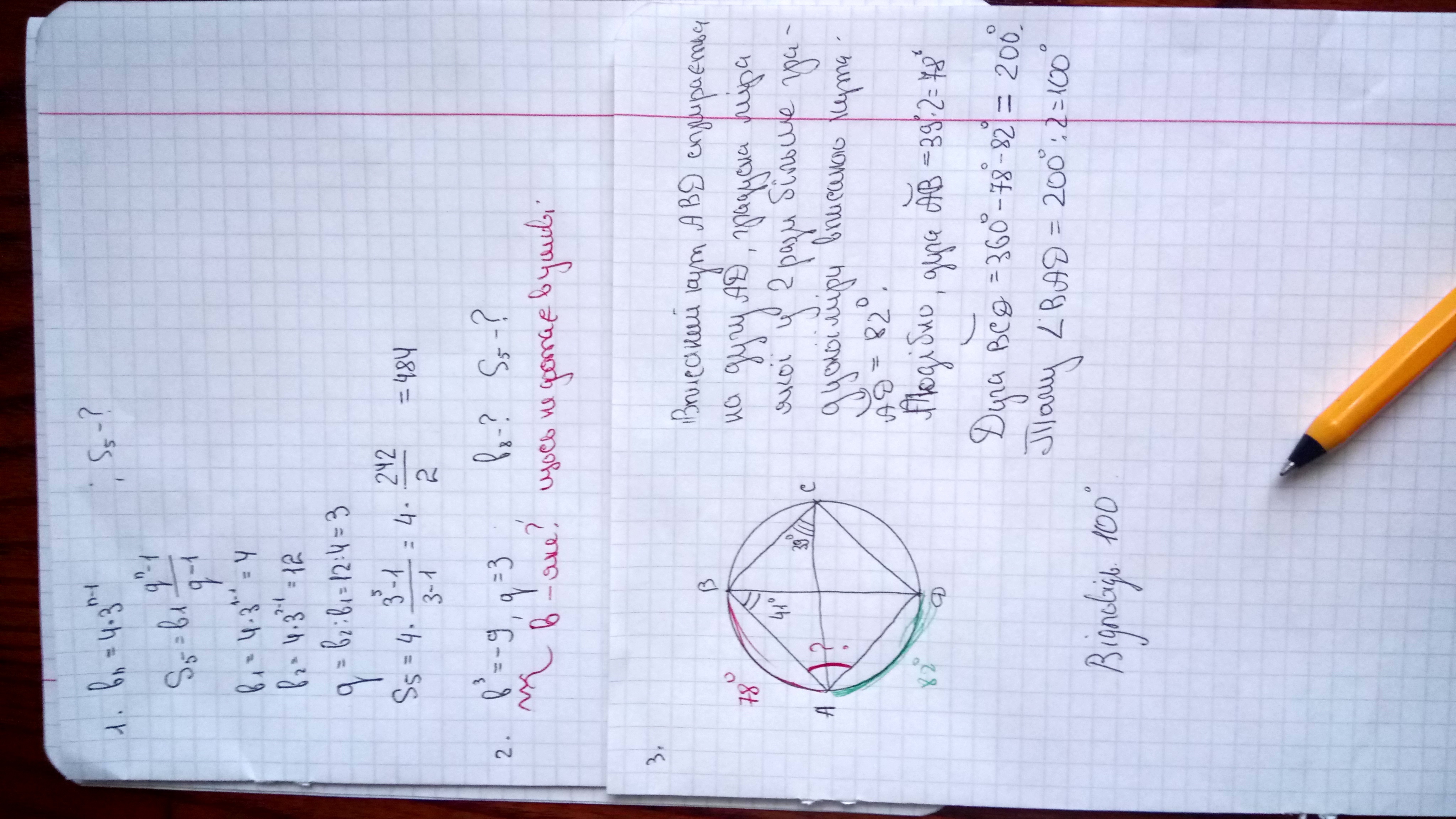 3) Знайдіть градусну міру кута BAD чотирикутника ABCD, вписаного в коло, якщо уголABD=41град., уголACB=39град.