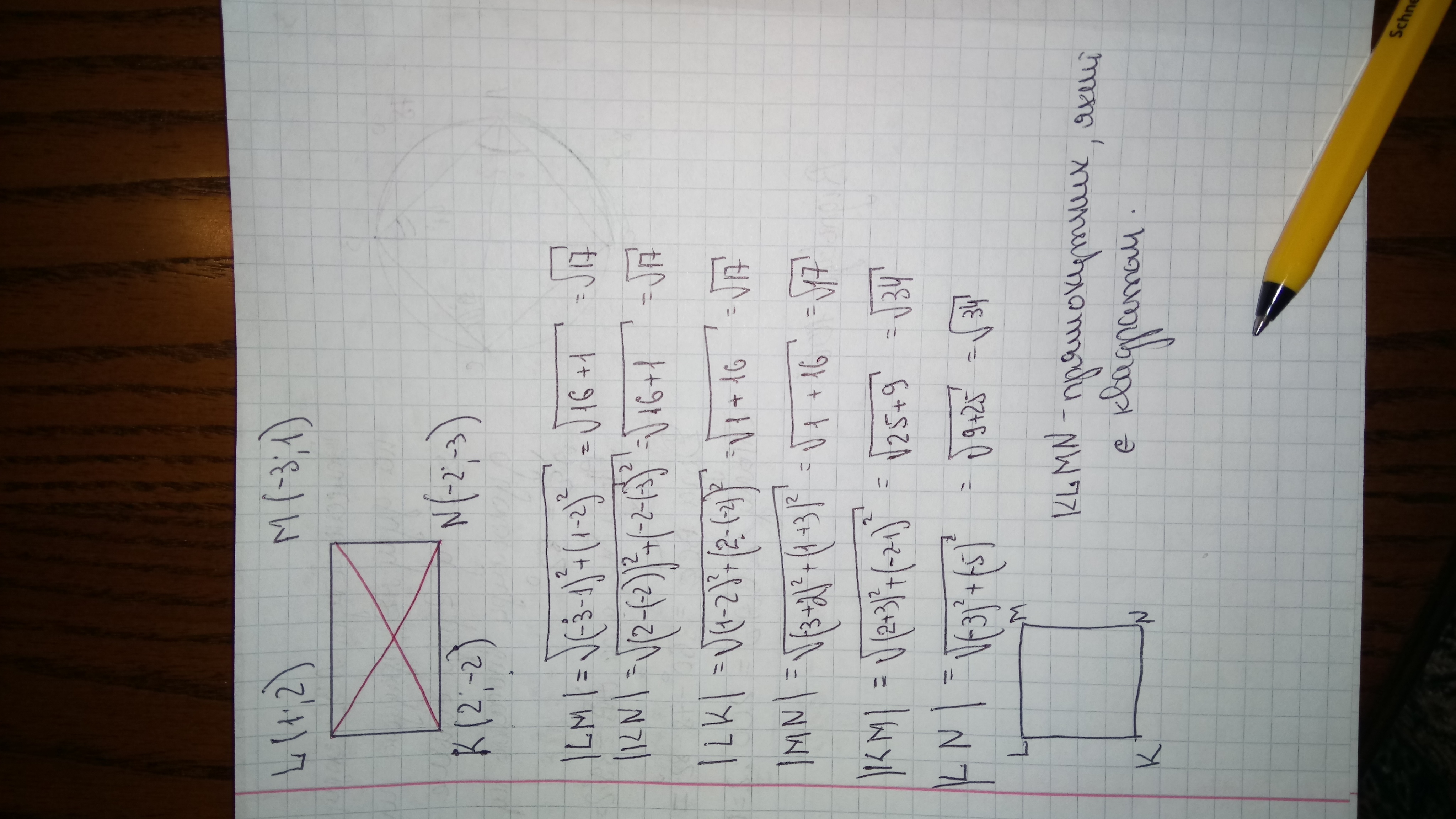 Доведіть,що чотирикутник KLMN з вершинами в точках K(2;-2), L(1;2),M(-3;1), N(-2;- 3) є прямокутником.